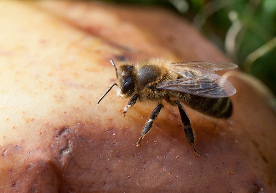 Deze bij vloog plotseling door het beeld. De sluitertijd van mijn camera was daar niet op ingesteld. Door de laagstaande zon werd het een ‘gouden’ bij en mag deze hier een plekje krijgen.
