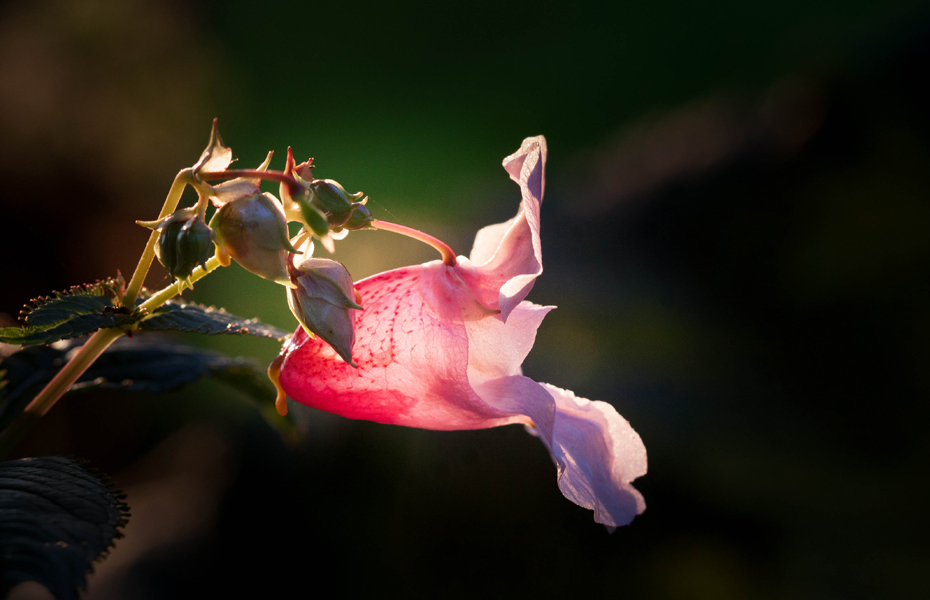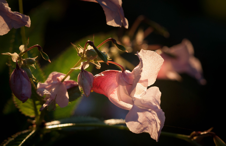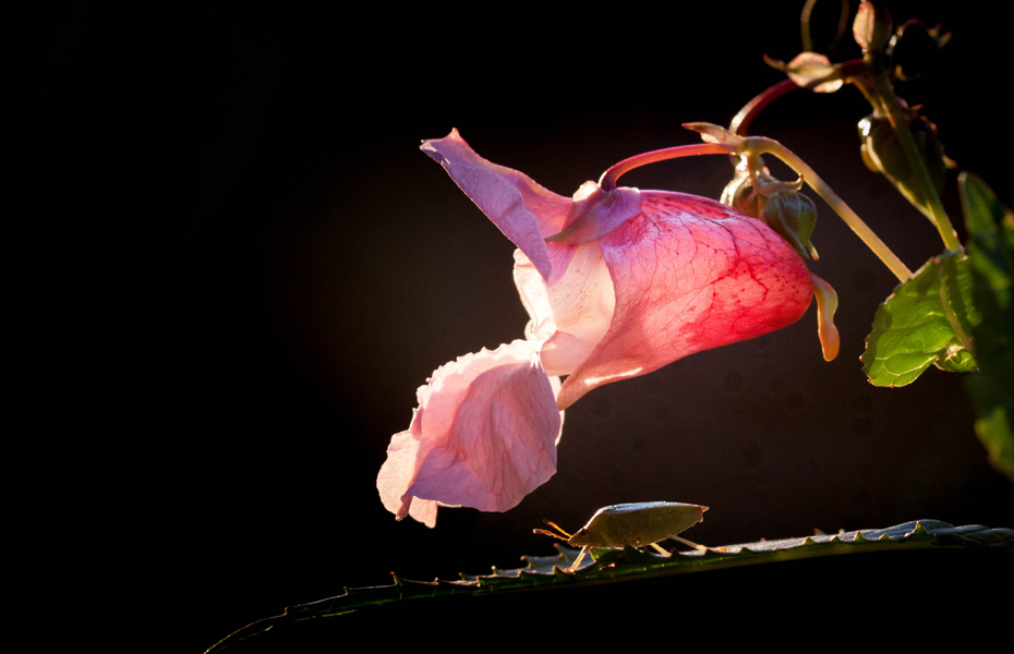 In onze tuin staat hier en daar springbalsemien. Het is een exoot wat een gruwel is voor velen. Bij ons mag het beperkt blijven staan. De springbalsemien verspreidt zich gemakkelijk, maar kan zich bij de droge zomers van de laatste paar jaar maar moeilijk handhaven. We zijn blij met de springbalsemien omdat het een lekkernij biedt aan vele insecten. Op een vooravond stond de springbalsemien te pronken vlak in het zonnetje.