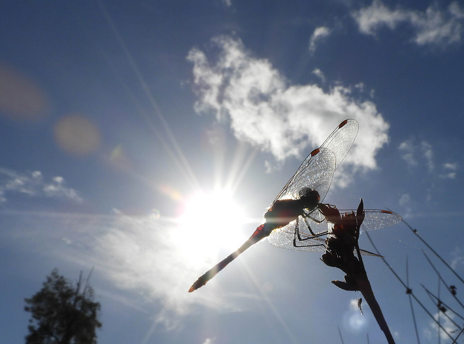 Na de fotosessie van de dreigende luchten boven Aekingerzand wandelde ik terug naar de auto. Bij een ven vloog een bloedrode heidelibel. De libel zocht een plekje waarbij ik deze kon vastleggen met de zon op de achtergrond. De lensflare of zonneflare hoort erbij…