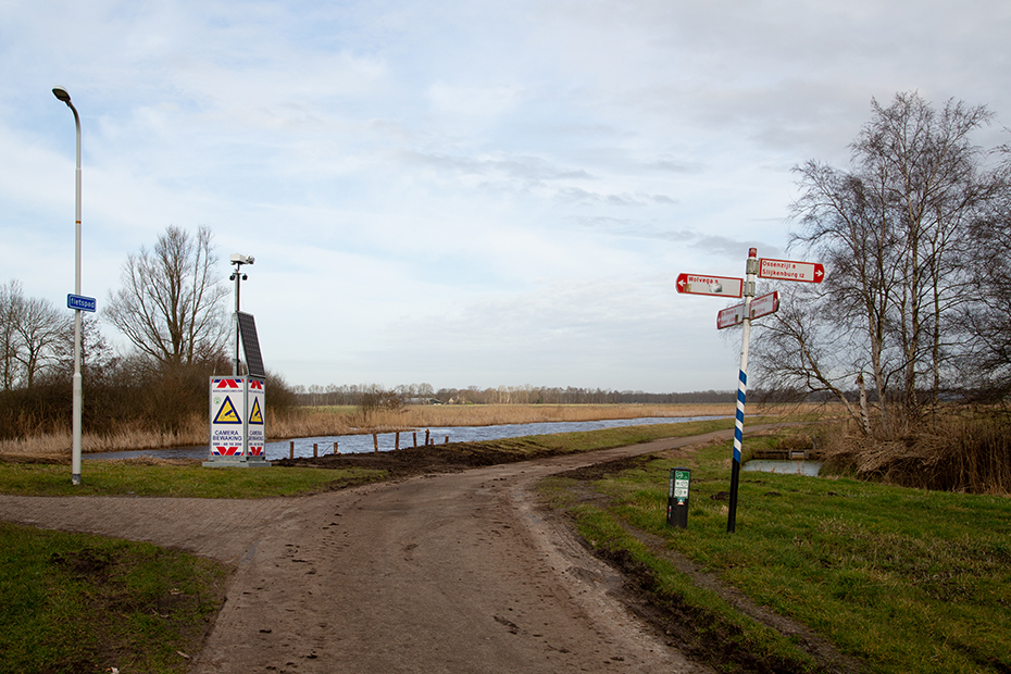 Vanaf de observatiewand reden Jan en ik naar het riviertje de Linde. Op dit plekje heb ik al meerdere keren de ijsvogel vastgelegd. Ik hoopte van harte dat de ijsvogel op deze plaats de korte maar strenge winter wel heeft overleefd. Vanaf de parkeerplaats wandelden we naar het water. Tot mijn verrassing staat daar een bewakingscamera. Ik heb geen idee waarom er op dat punt camerabewaking is.