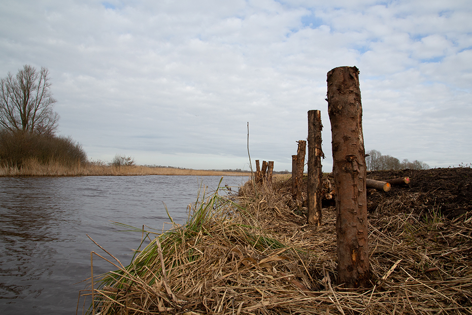 Nadat ik een tijdje op het bruggetje op de uitkijk had gestaan daalde ik af naar de oever. Ik heb geen idee wat voor doel men voor ogen heeft met deze creatie.