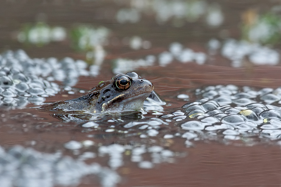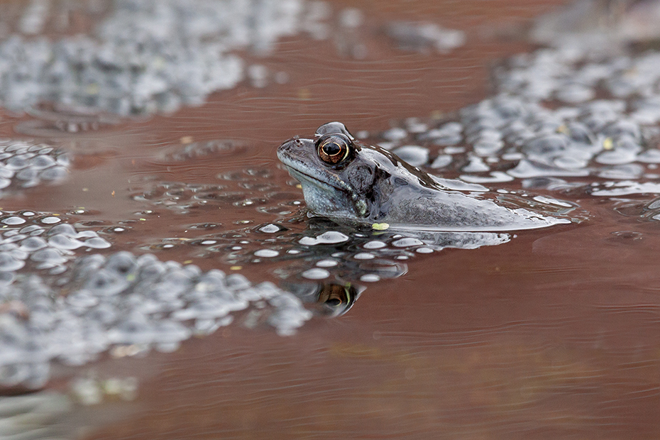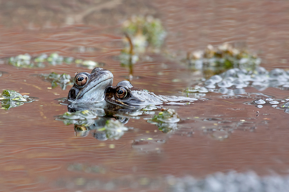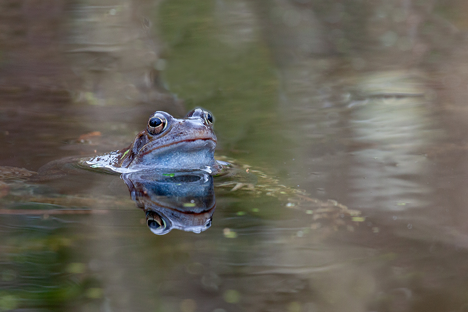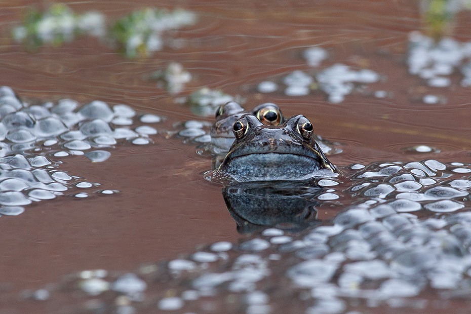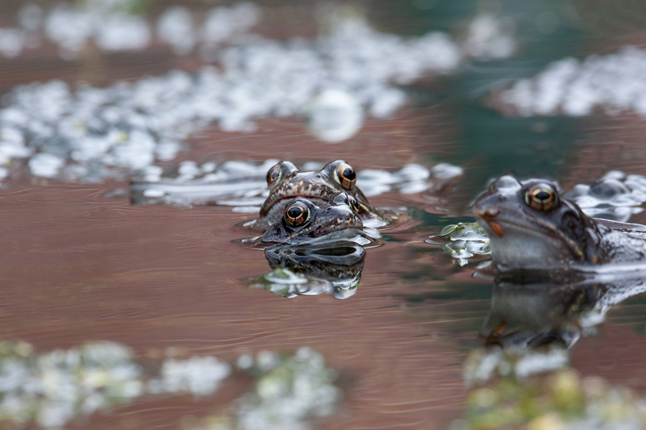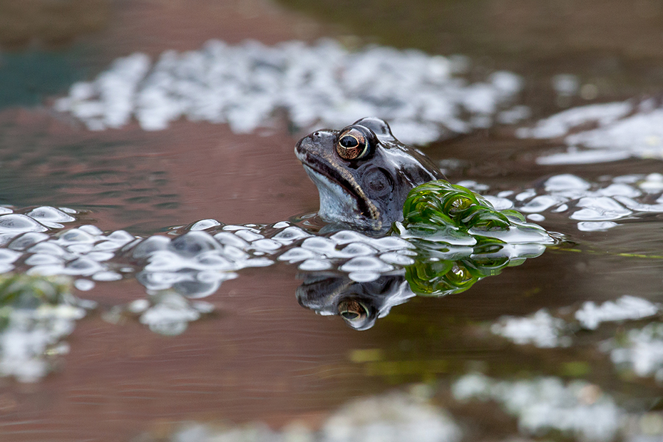 Na een paar minuten kwamen de koppies van de kikkers een voor een weer boven water. Behoedzaam en ‘verstopt’ achter de camera begon ik dan te fotograferen. Op die manier bleven de kikkers voor me poseren.