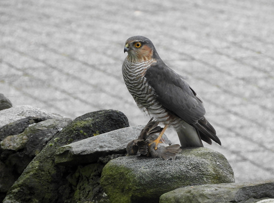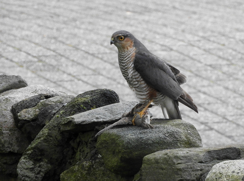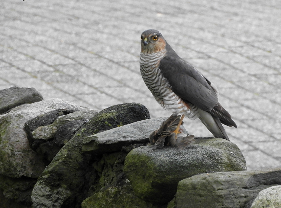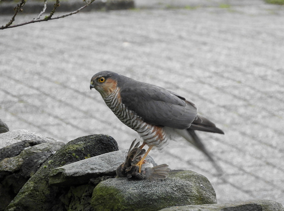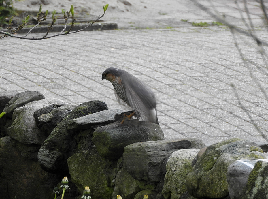 Het was dinsdag 4 mei, 19:40 uur. We keken naar de Dodenherdenking op t.v. Er vloog iets groots langs het raam. Er was paniek in de voortuin. Het volgende moment zat er een sperwer op het muurtje met in zijn klauwen een mus.