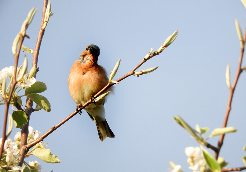 Een vink, een mannetje zat bovenin de perenboom. De avondzon en de bloesem maakten het plaatje compleet.
