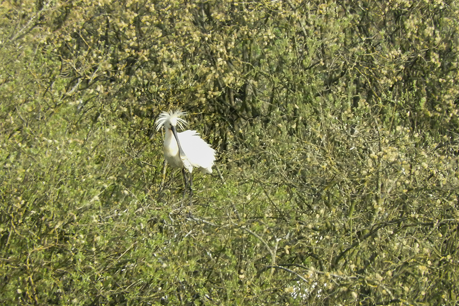 Zoals ik in het vorige bericht al schreef en op bovenstaande foto is te zien, zaten de genoemde vogels ver bij de kijkhut vandaan. De meeste lepelaars zaten verscholen in de bosschage. Na enig geduld kon ik eindelijk een lepelaar vastleggen die zich in volle glorie liet zien. Inclusief het verwilderde kapsel.