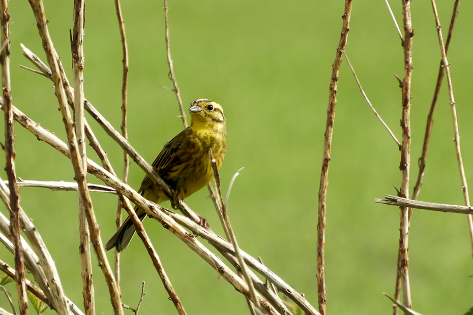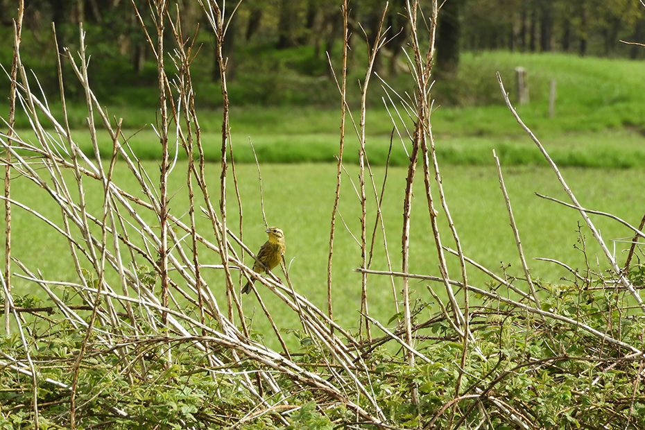 Op de Grote Esweg even buiten Ansen zat een roodborsttapuit op een polletje gras in een weiland. Vanuit de auto kon ik één foto maken en toen vloog de vogel weg. Die foto is niet scherp geworden. Ik bleef een tijdje staan wachten of de roodborsttapuit terug zou keren. Op het volgende moment landde er een geelgors in het struweel aan de kant van de weg.