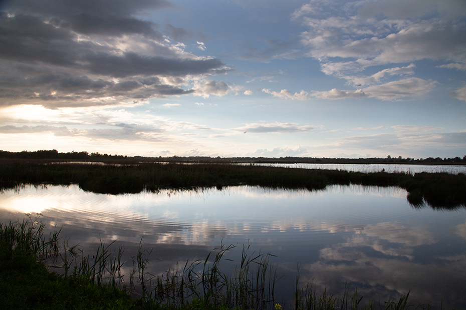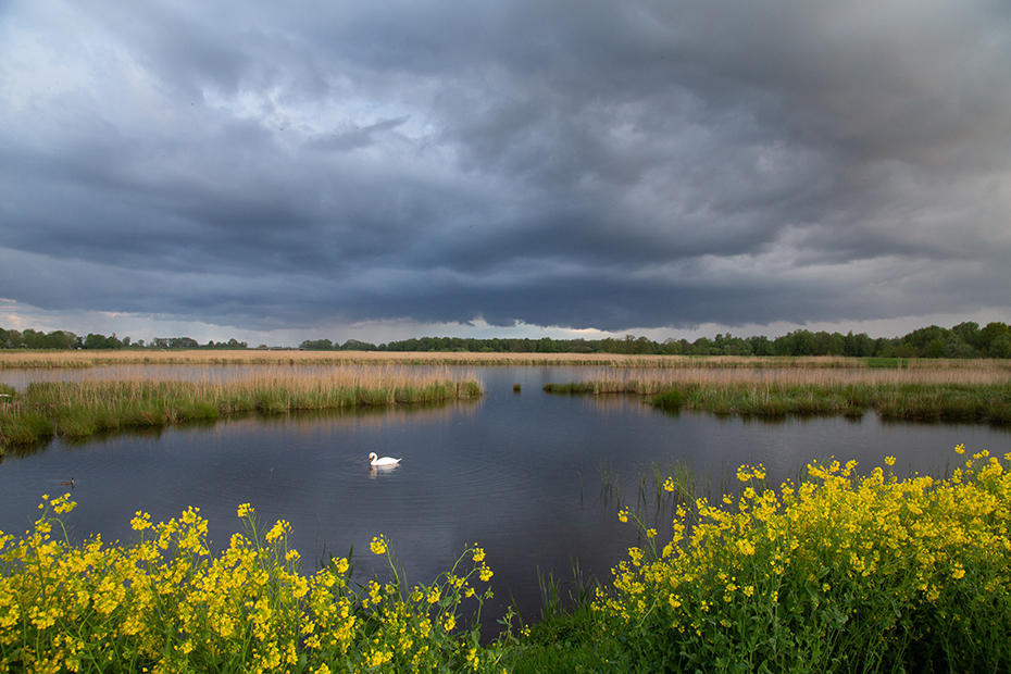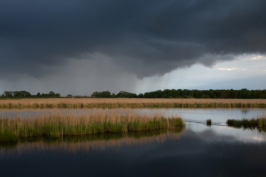 Vanaf de Hogeweg in De Weerribben reed ik naar de Rietweg. De Rietweg ligt tussen de buurtschappen Wetering en Nederland. Daar heb ik een tijd met bewondering naar de dreigende lucht staan kijken. In de verte regende het en rommelde het een beetje.