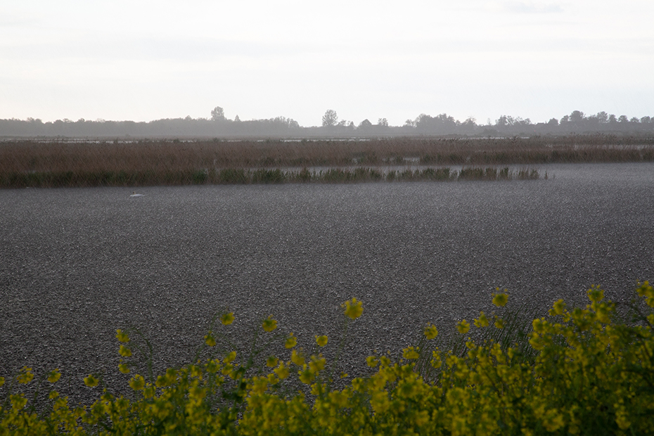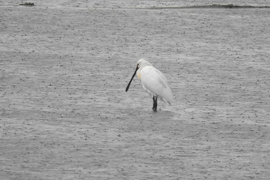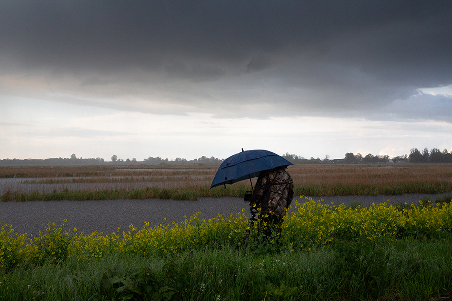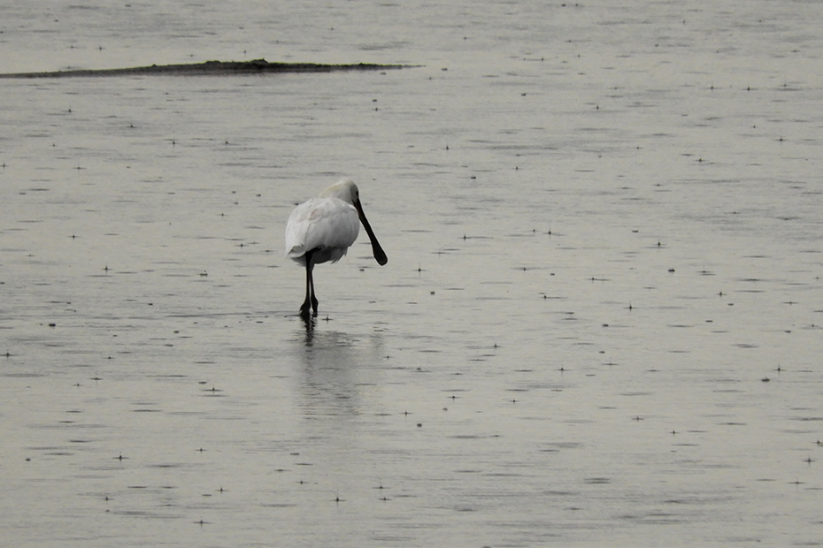 Vanaf de Rietweg reed ik naar vogelkijkhut, de Twitterhut. Vanaf de auto overbrugde ik in een drafje de tien meter naar de kijkhut. Vanuit die hut zag ik in de verte een lepelaar in de regen staan. Toen de ergste regen voorbij was ging de lepelaar verder met het foerageren.