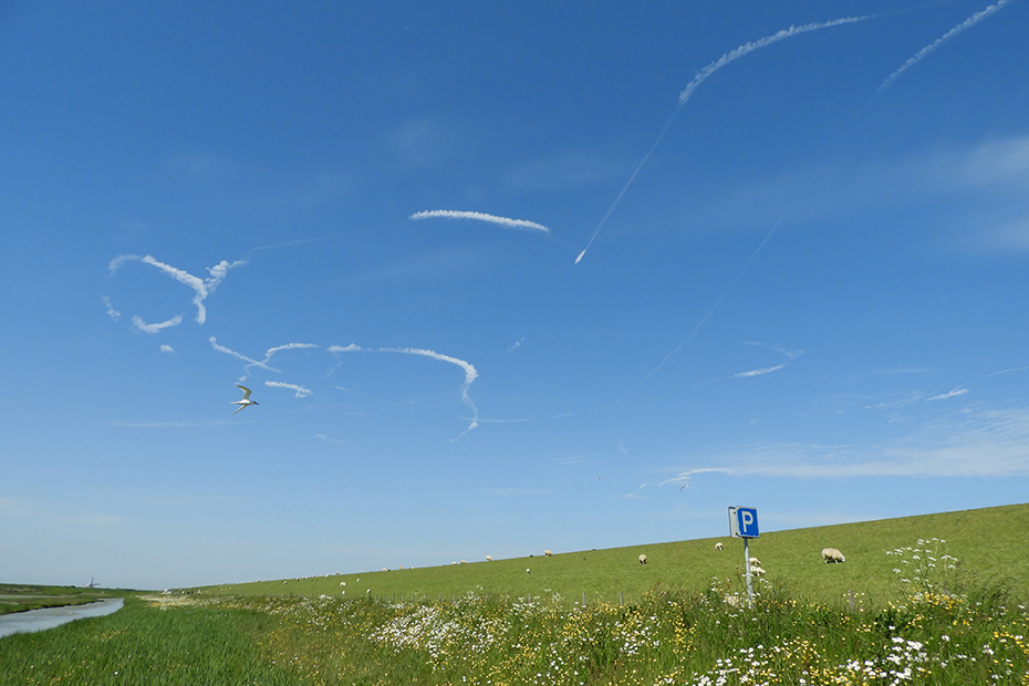 Toen ik weer in de auto wilde stappen viel mijn oog op wel een heel bijzonder patroon in de lucht. Ik denk dat dit een grapje van een piloot was.