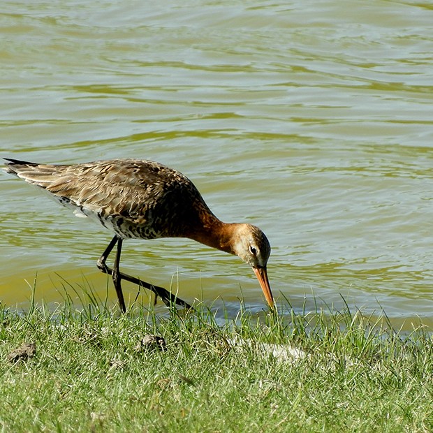 Binnendijks stond een grutto te foerageren. Het foerageren werd zo nu en dan onderbroken voor een korte poetsbeurt.
