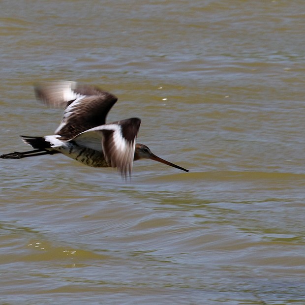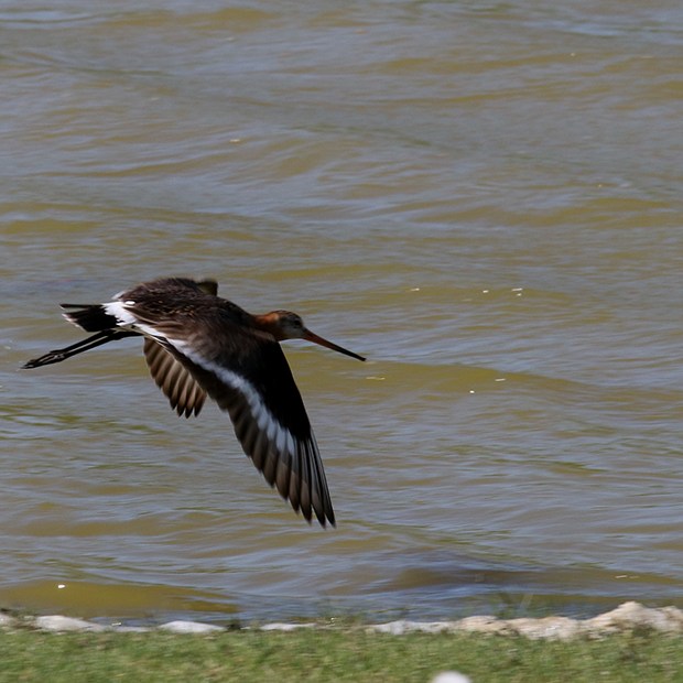 Aan de overkant van het water werd een scholekster mij gewaar en begon alarm te slaan. Dat was voor de grutto het moment om op de wieken te gaan.