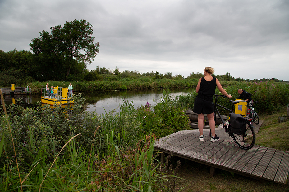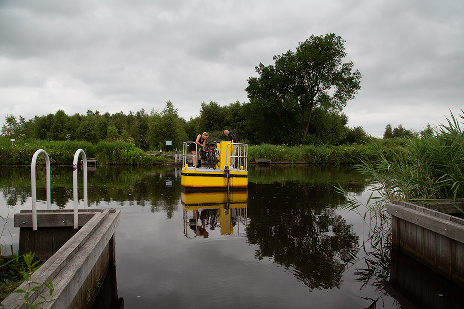 Het pontje kwam net vanaf de overkant naar ons toe. Terwijl we stonden te wachten kwam er een echtpaar op de fiets en die lieten we mooi voor gaan. Zo konden wij de kunst afkijken en meteen enkele foto’s nemen.