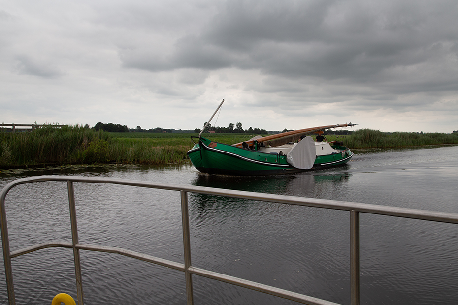 De eerste helft van de oversteek stond Jan aan de lier en halverwege mocht ik het overnemen. Terwijl we overstaken kwam er om de bocht een skûtsje aangestoomd. Voor ons gevoel moesten we toch wel even flink doordraaien…