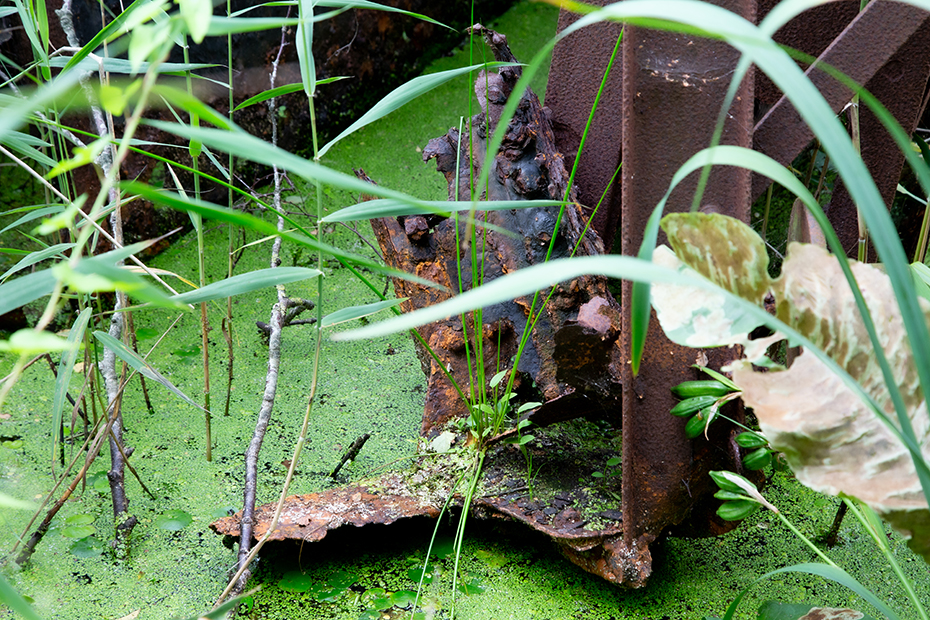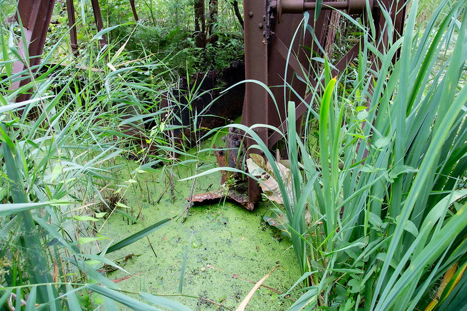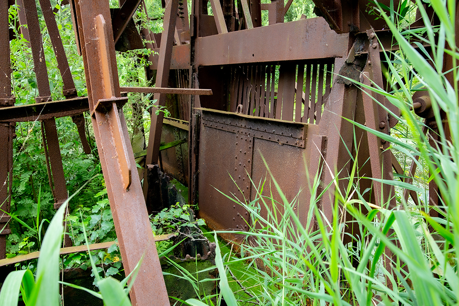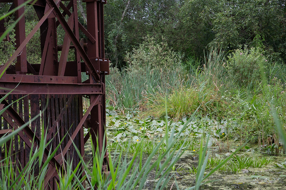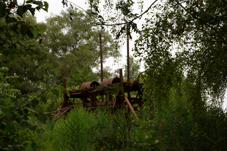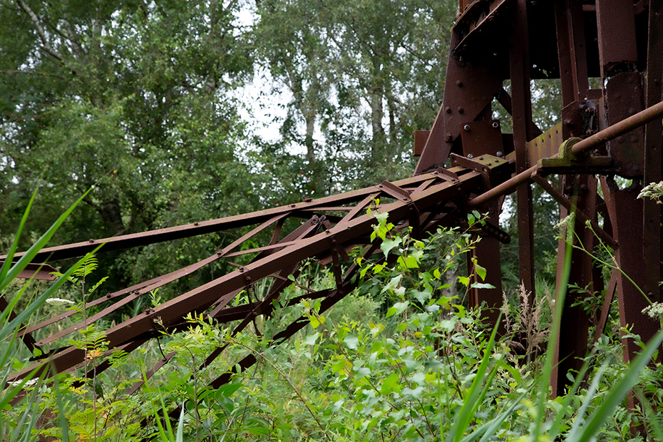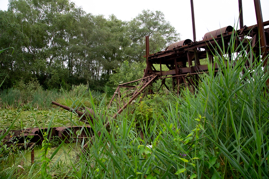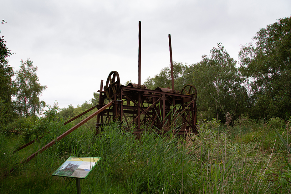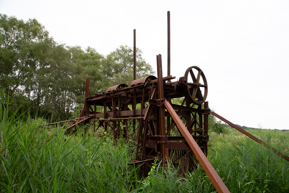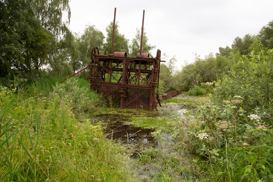 Vanaf het pontje was het nog maar een stukje lopen naar het paadje wat naar de baggelmachine leidde. We zeiden tegen elkaar dat we het vreemd vonden dat er naast het fietspad geen verwijzing staat naar die bewuste machine. Een onwetende fietser en wandelaar gaat daar zo aan voorbij en dat is toch jammer bij dit industrieel erfgoed.