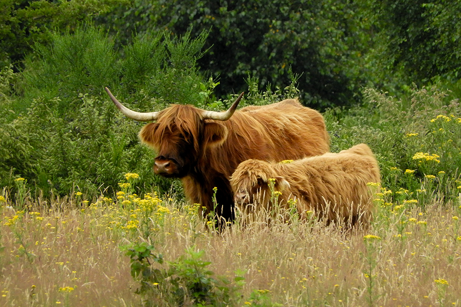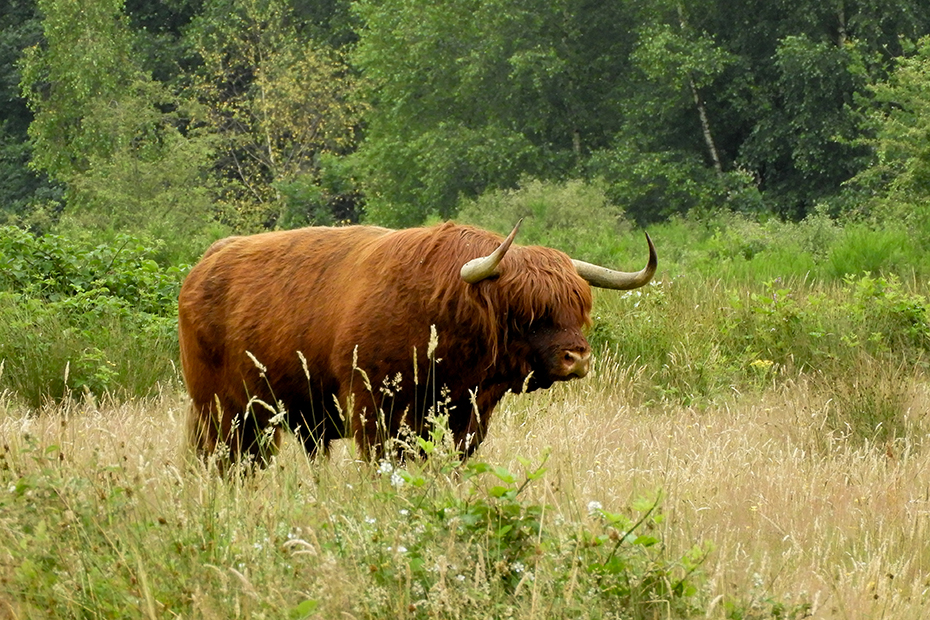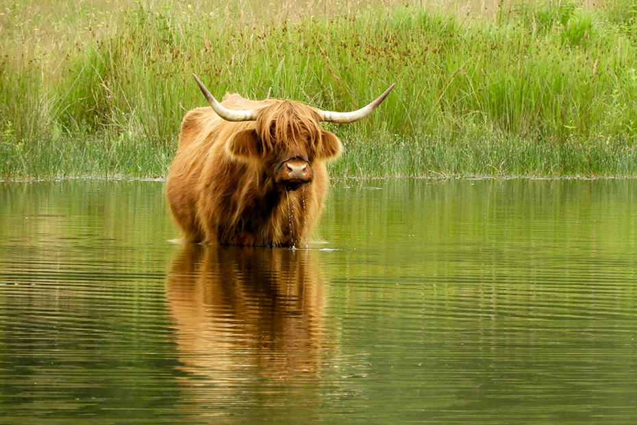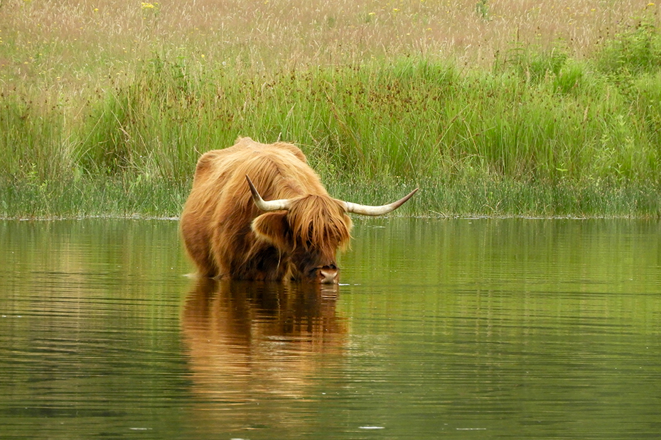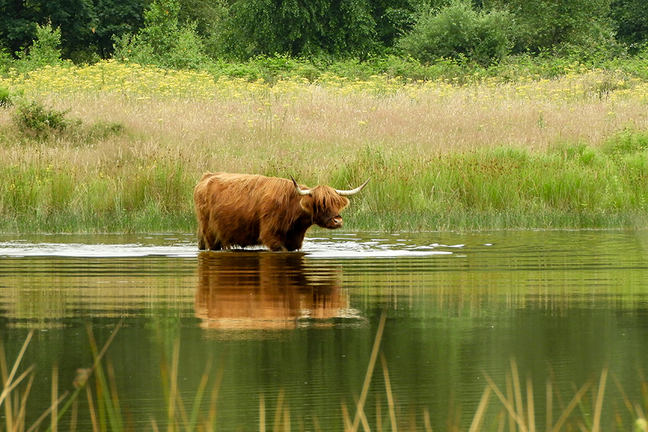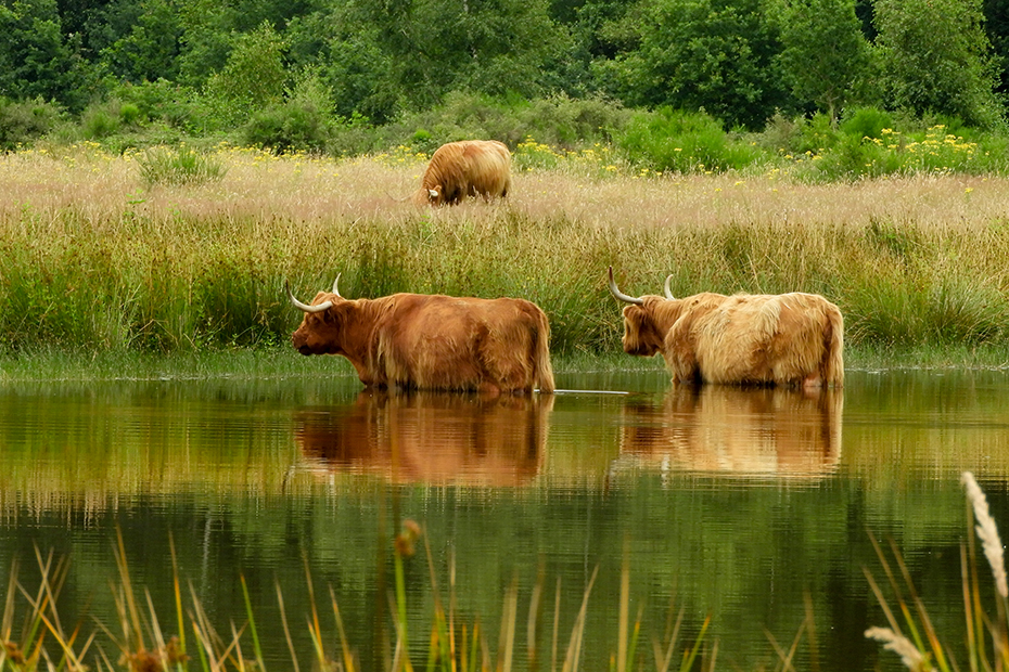 Na een mooie wandeling kwam ik uit bij een ven waar twee Schotse hooglanders tot aan hun buik in het water stonden.