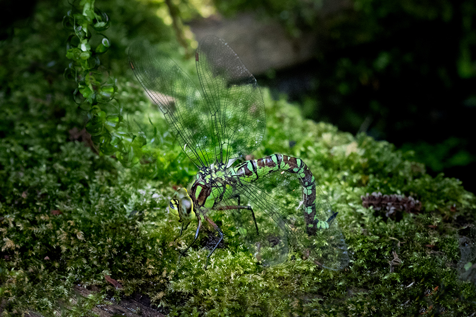 Een paar dagen geleden streek er een grote keizerlibel neer op het mos aan de rand van onze vijver. Het vrouwtje zette daar haar eitjes af. Ik had mijn camera met zoomlens 100 – 400 mm bij de hand.