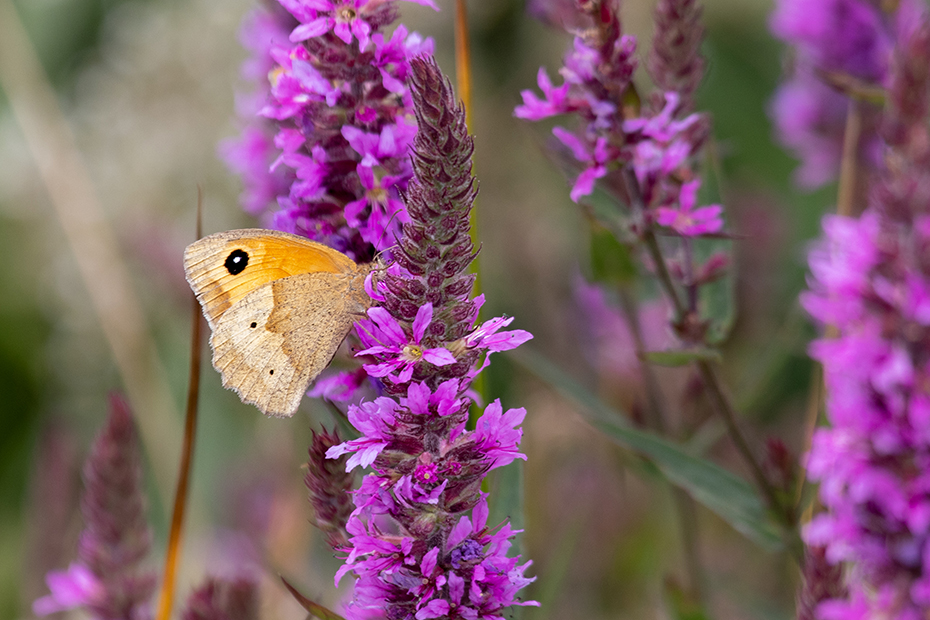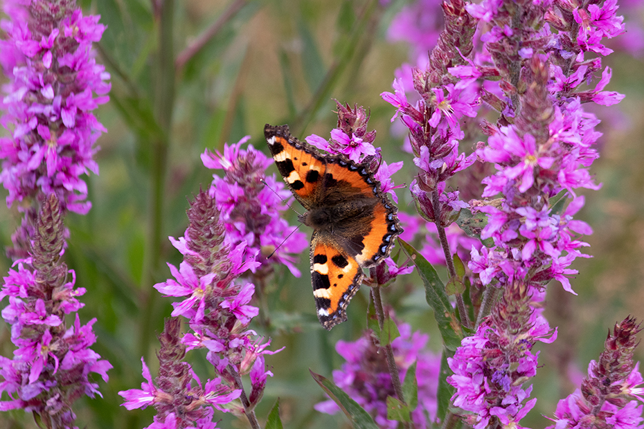 In de sloot stonden veel kattenstaarten. En tot onze verrassing wemelde het op die kattenstaarten van de vlinders. De kleine vos, dikkopjes, bruine zandoogjes en andere insecten deden zich tegoed aan hetgeen de kattenstaarten te bieden hadden. De kleine vos vind ik een van de mooiste algemeen voorkomende vlinders.