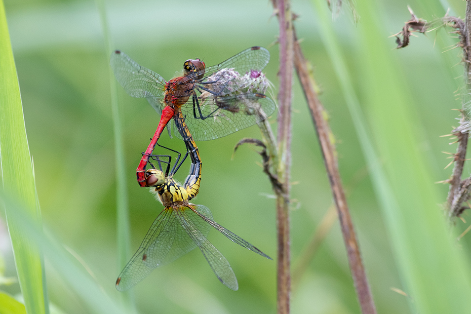 Dan de bloedrode heidelibellen, die kozen een mooier plekje uit. Gefotografeerd in Woldlakebos in Nationaal Park Weerribben-Wieden.