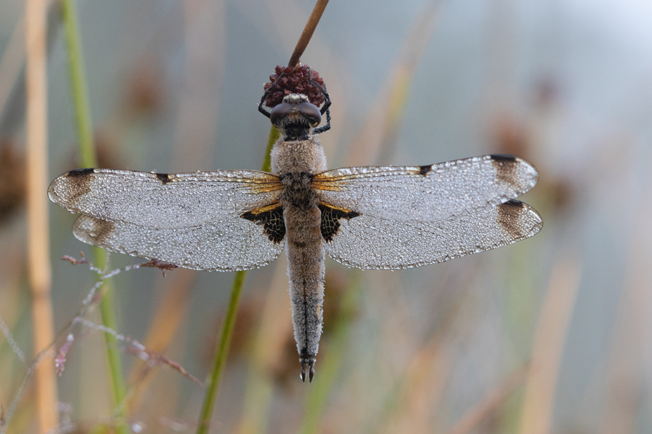 Het is wel bijzonder dat deze libel nauwelijks was behangen met dauwdruppels en andere wel.