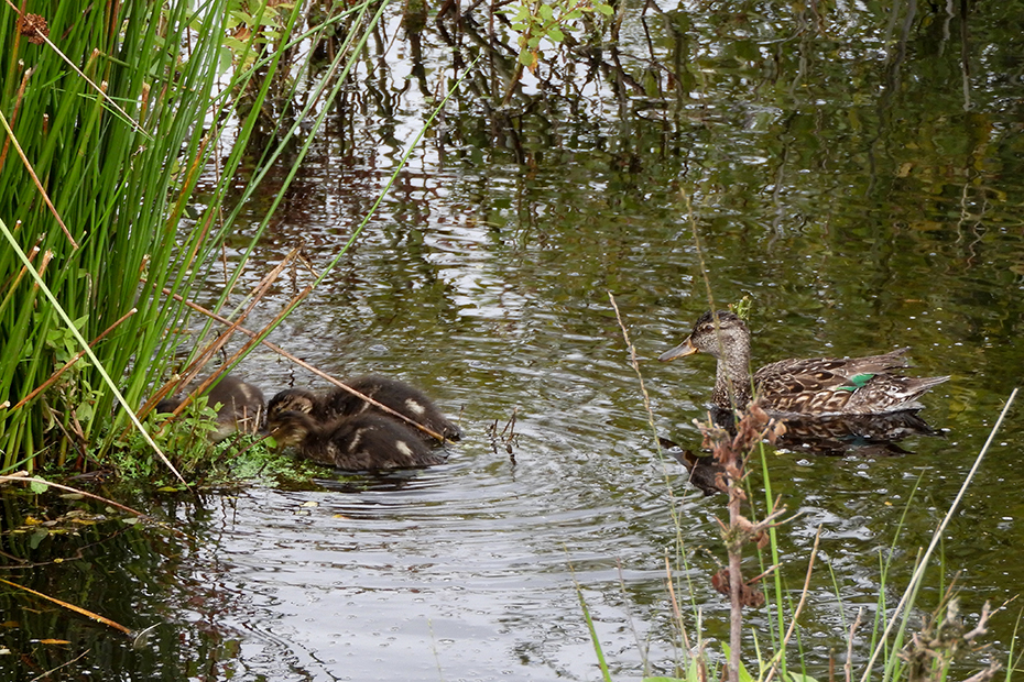 In deze tijd van het jaar leek mij een eend met jongen vrij uitzonderlijk. Op een site las ik dat het broedseizoen voor eenden tot ongeveer augustus loopt. Wintertalingen zoeken hun voedsel door het wateroppervlak te filteren en door te grondelen. De meeste tijd zaten ze met hun koppies onder water.