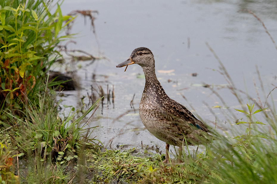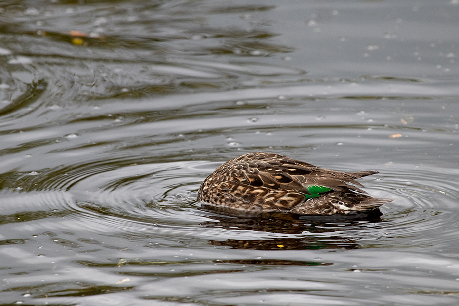 Het viel mij als eerste op dat het een relatief kleine eend was. Verder vond ik de groene kleur bijzonder die ik tussen de andere veren door zag schemeren. Later op de computer kon ik de eend determineren als een wintertaling, een vrouwtje. De wintertaling staat op de rode lijst als kwetsbaar.