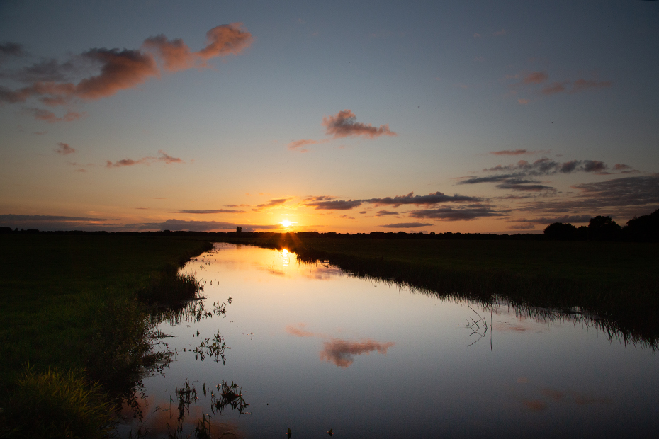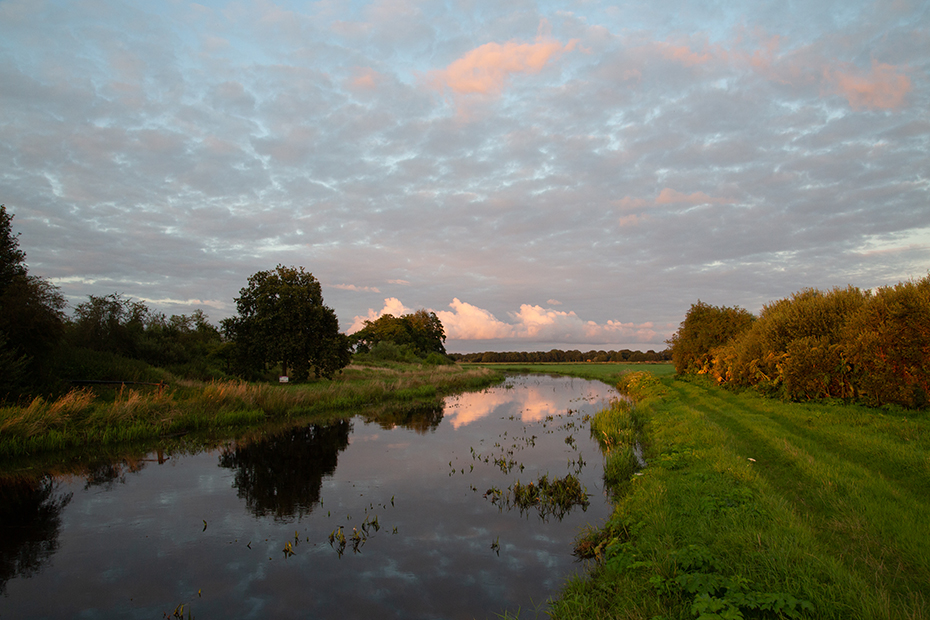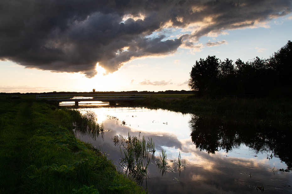 Op een avond maakte ik een wandeling langs ‘t Holtien en de Dwingelderstroom. Boven de stroom hing een inktzwarte wolk. Wonderwel vielen er geen druppels uit deze wolk. De ondergaande zon piepte er even later mooi onderdoor.