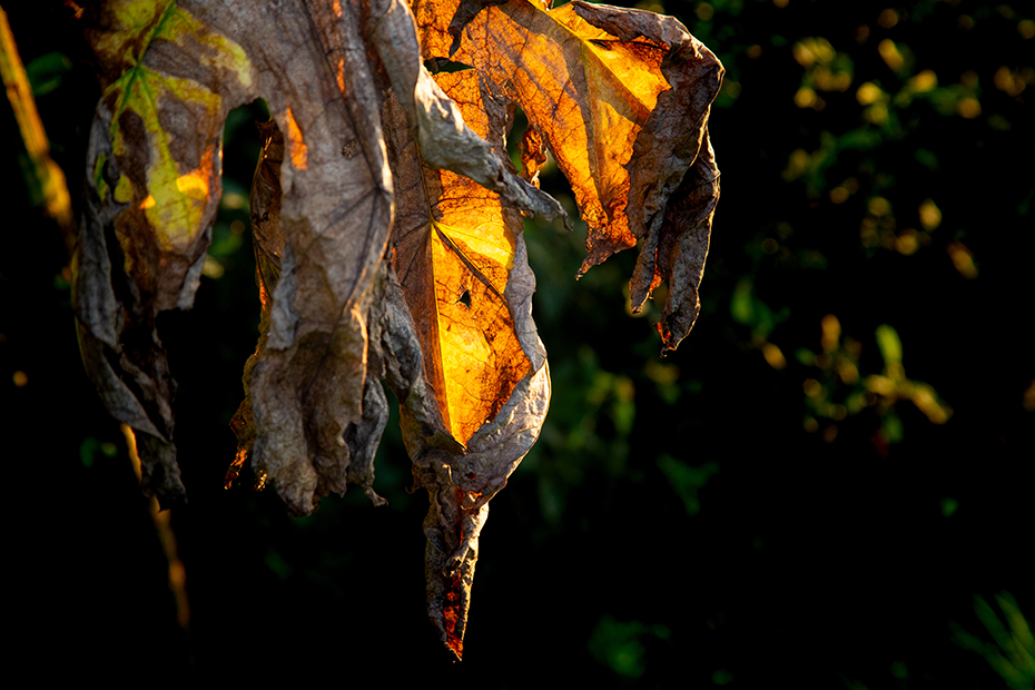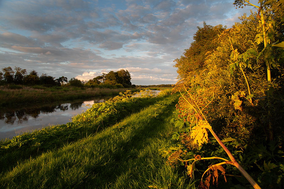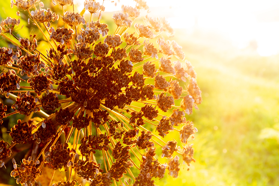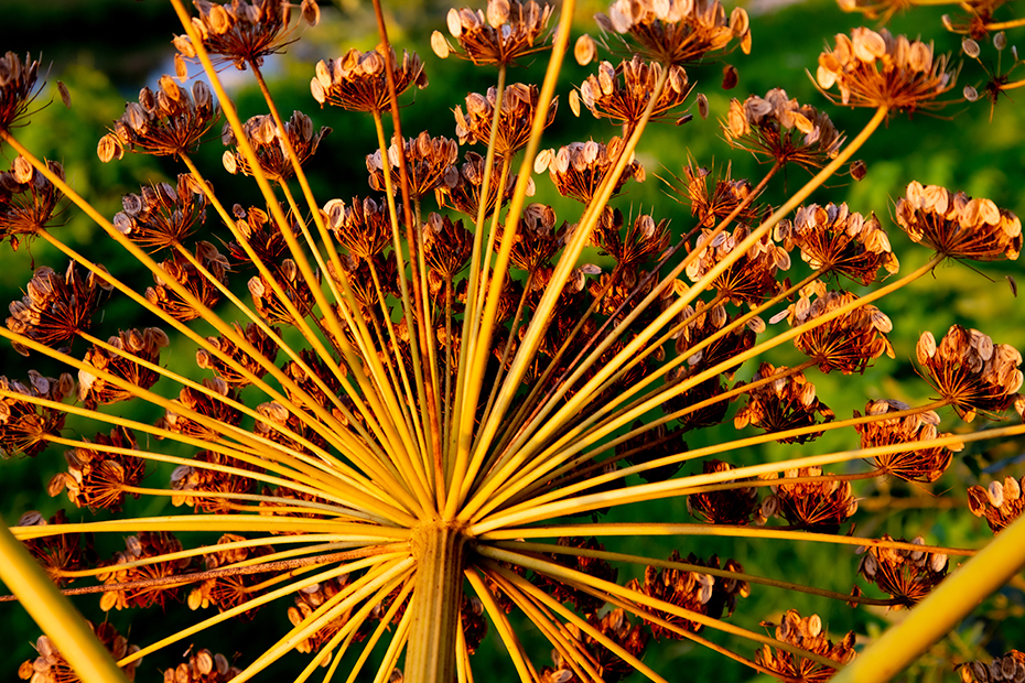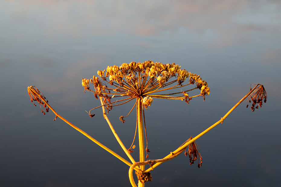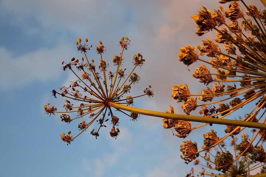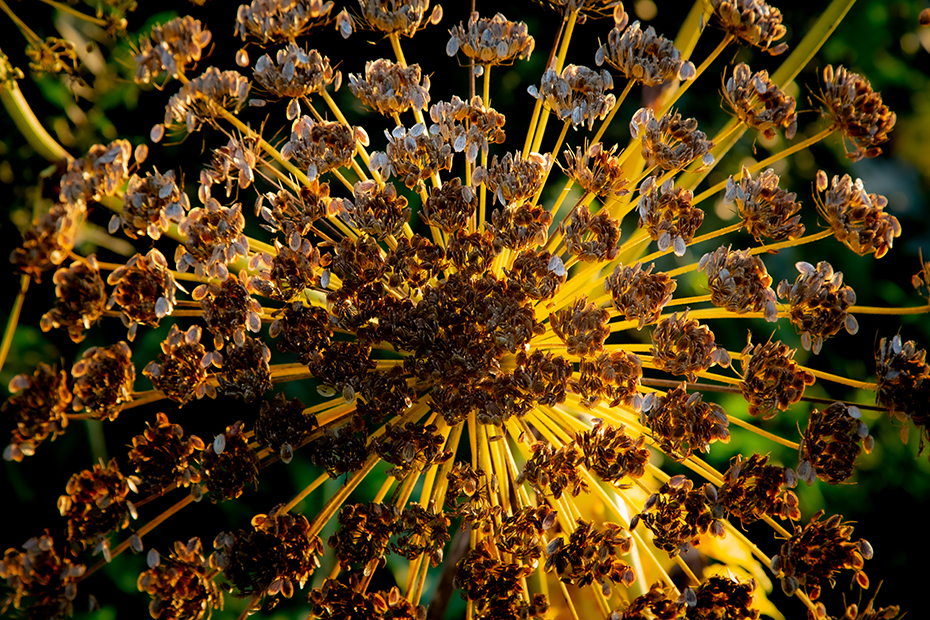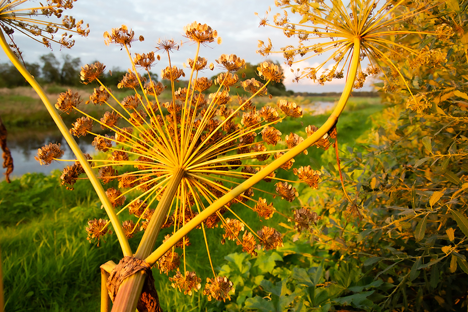 Toen ik de andere kant opkeek zag ik dat de reuzenberenklauw mooi beschenen werd door de avondzon. Met de camera leefde ik mij uit op de berenklauw.