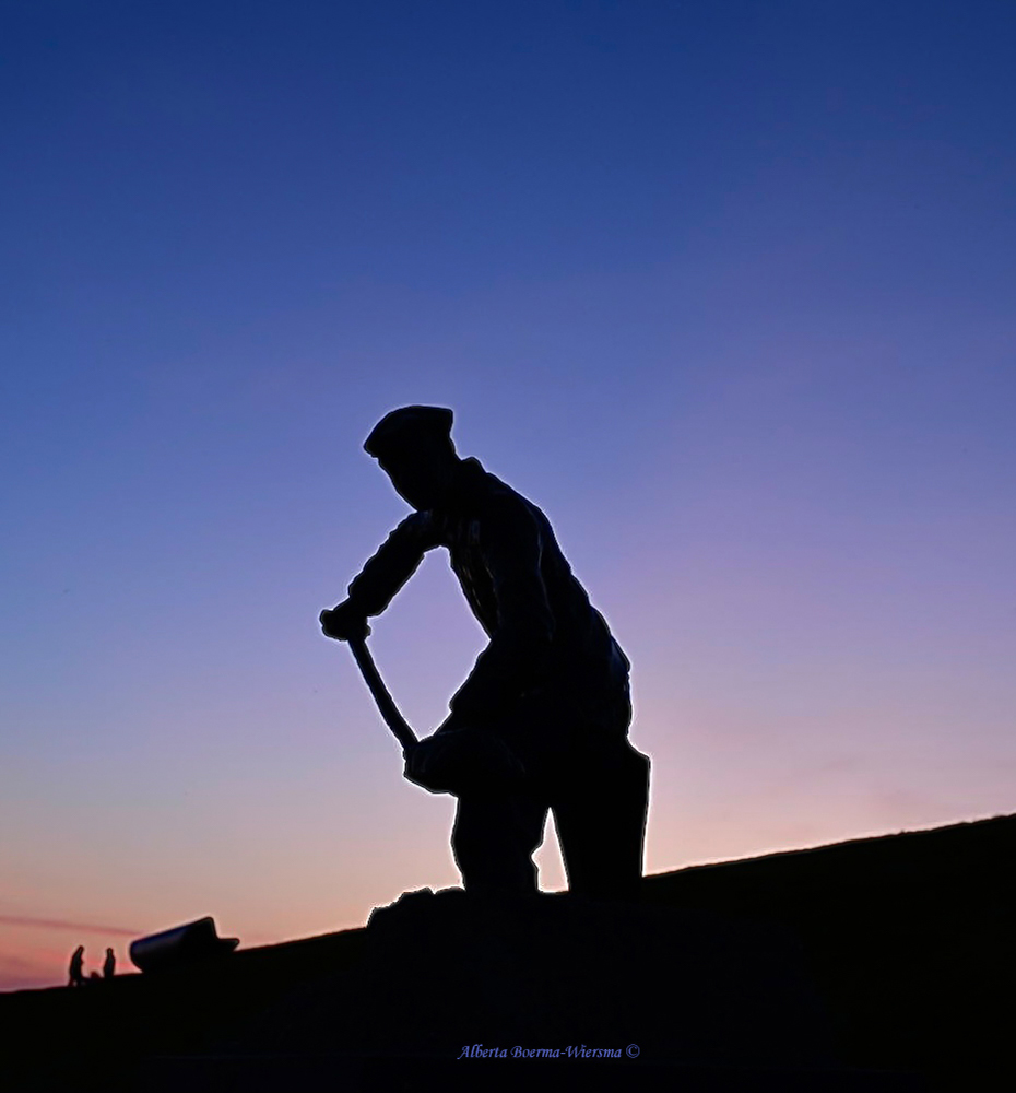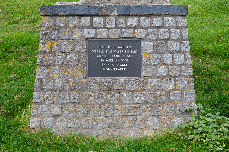 Op de plaquette staat, vertaald… hier op de wadden wereld van water en slik, won hij land uit zee in weer en wind, schep voor schep monnikenwerk.
