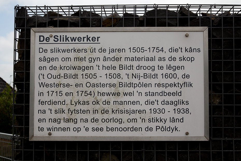 De slikwerkers uit de jaren 1505 1754, die kans zagen om met geen ander materiaal als de schep en kruiwagen ‘t hele Bildt droog te leggen )’t Oud-Bildt 1505 1508, ‘t Nij-Bildt 1600, de Westerse- en Oostere Bildtpolders respectievelijk in 1715 en 1754) hebben wel een standbeeld verdiend. Evenals de mannen die dagelijks naar het ‘t slik fietsten in de crisisjaren 1930 – 1938, en nog lang na de oorlog, om een stukje land te winnen op de zee ten noorden van de polderdijk.