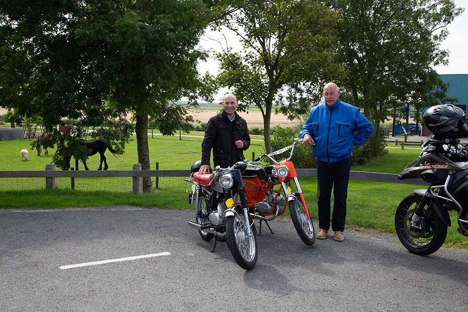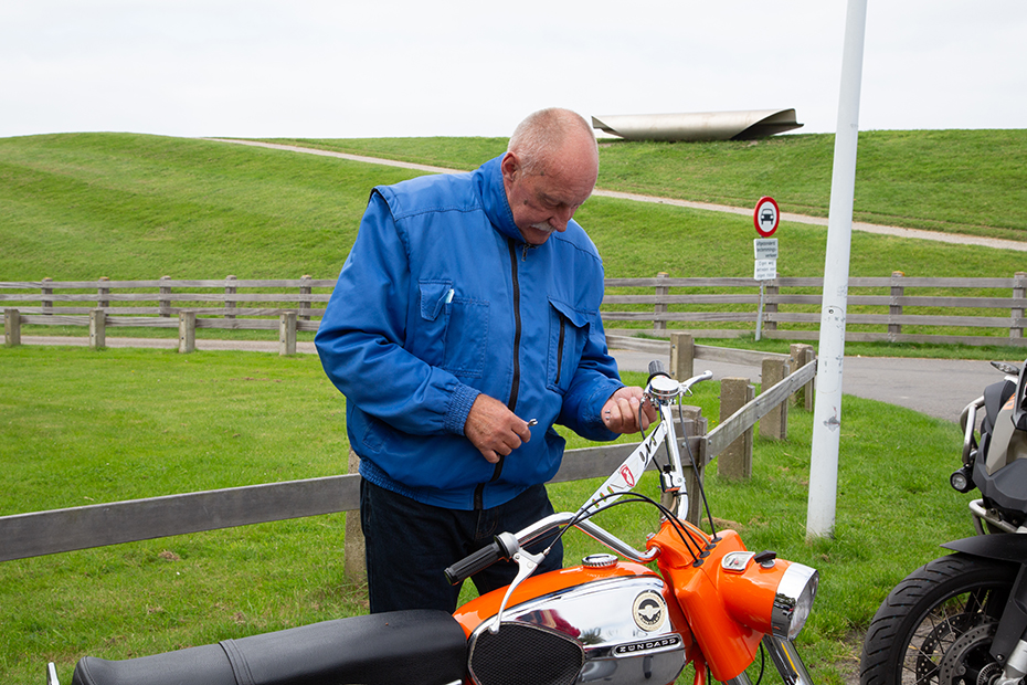 De beide mannen waren wel in voor een praatje en vertelden vol trots over hun brommers. Tijdens de tocht moest er nog wel een paar maal gesleuteld worden aan de brommer, zo vertelde de man.
