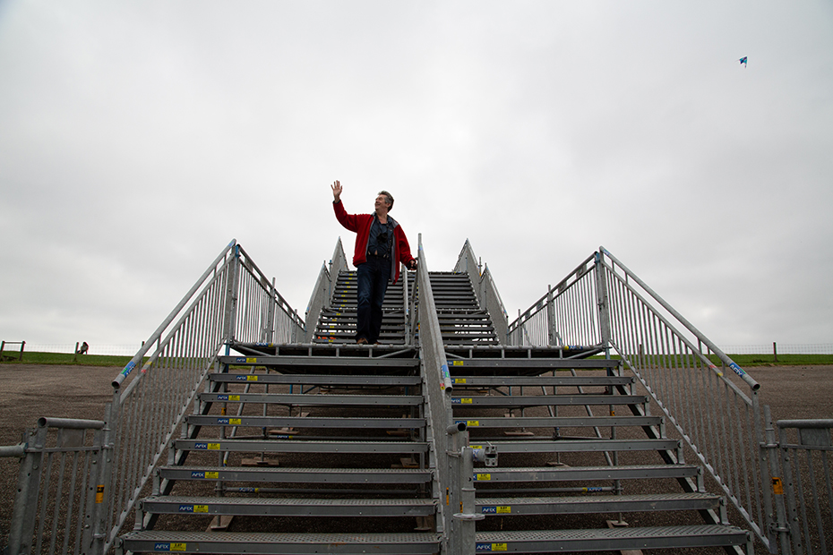 Na deze fotosessie moesten we weer aan de andere kant van de dijk zien te komen. Deze keer namen we de trap. Jan zwaaide nog even naar een denkbeeldig publiek. 😉