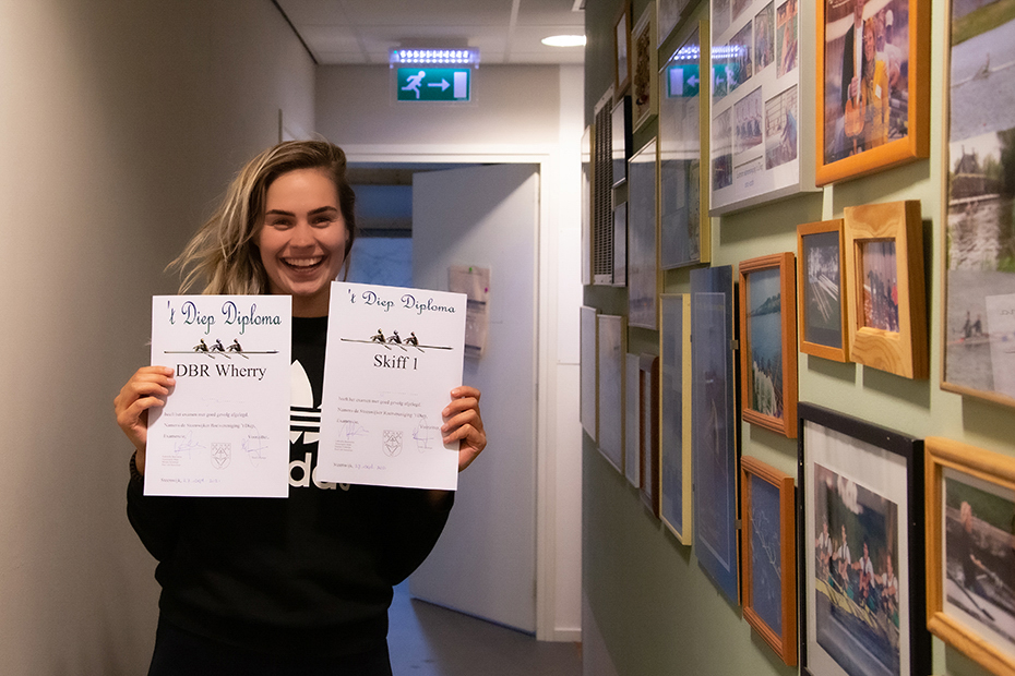 Toen ik daar arriveerde was onze dochter nog bezig met het theorie-examen. Eindelijk kwam ze uit de kamer en liet ze stralend haar diploma’s zien. Geslaagd! Zij heeft twee diploma’s tegelijk gehaald. Nu gaat ze door voor Skiff 2. Daarnaast is ze uitgenodigd door de wedstrijddames om met hen mee te roeien. Kennelijk heeft ze aanleg.