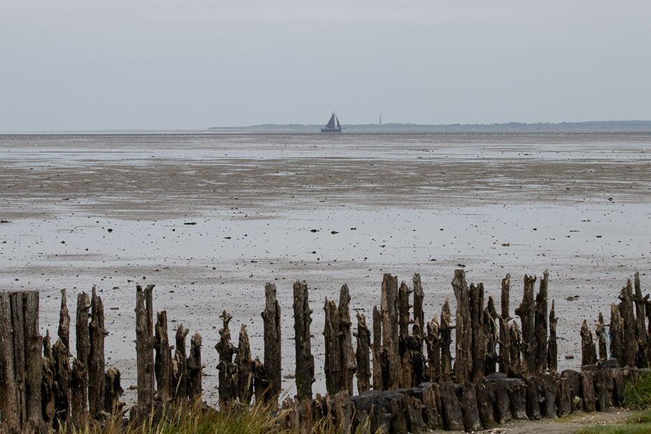 Op het Wad scharrelden een paar meeuwen hun kostje bij elkaar. In de verte voer een zeilboot langs. Aan de horizon kun je de vuurtoren van Schiermonnikoog ontwaren. Jan gaf deze serie met zijn rode vest toch nog een kleurrijke touch.