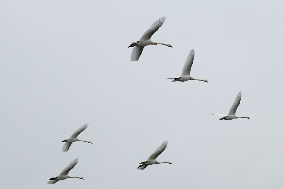 Ik wandelde door de Weerribben. De spiegelreflex met de 100 – 400 mm zoomlens had in de hand. Achter mij hoorde ik het kenmerkende geluid van vliegende zwanen. Het is gelukt om ze te vast te leggen op de gevoelige plaat.
