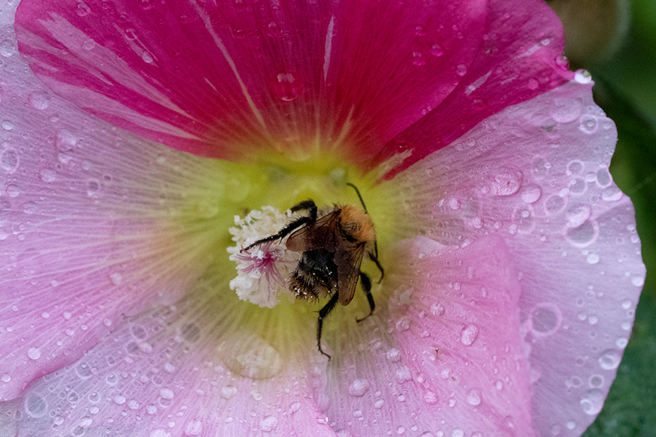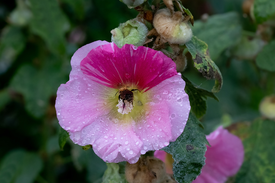 Terwijl ik inzoomde op de stokroos vloog er een hommel in beeld. Dat was wel het laatste wat ik verwachtte met dat buiige weer.