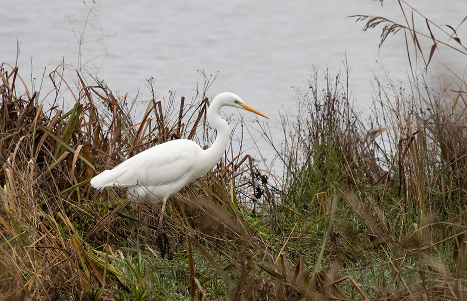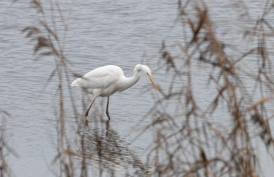 Schijnbaar was dat niet helemaal de goede plek, want de reiger wandelde verder naar de, met riet bedekte, oever.