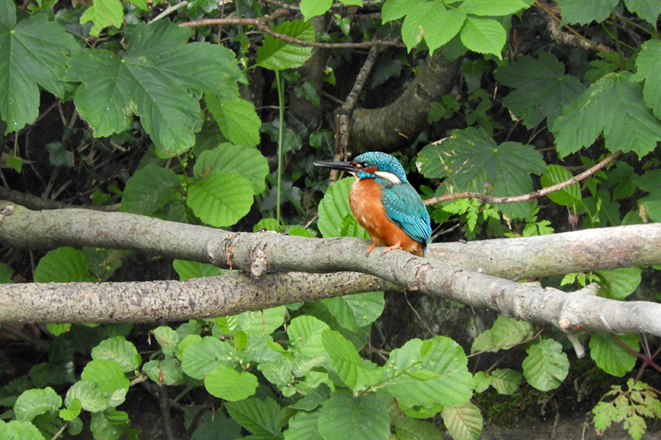 Hier kwam het vrouwtje met een visje in de snavel aangevlogen. Vrouwtje is te herkennen aan de oranje vlek aan de onderkant van de snavel. Het handige aan het spotten naar ijsvogels is dat je niet continu hoeft op te letten. Ze kondigen in de regel hun komst aan met een hoge pieptoon.