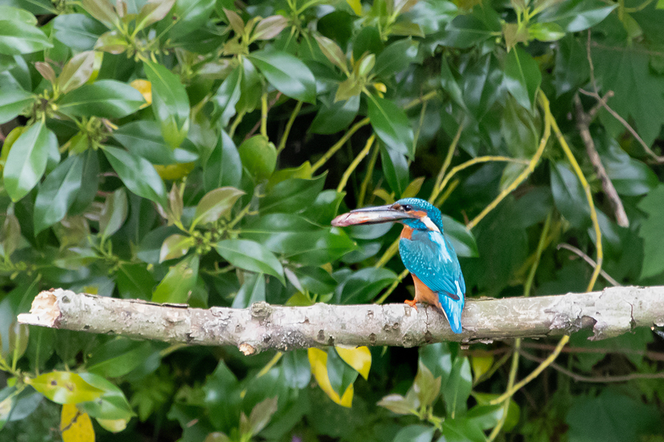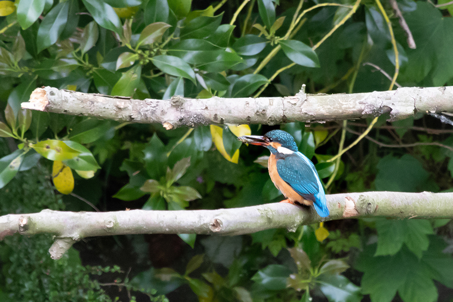 Een tijdje later kwam er weer een ijsvogel met een vis. Dat was een flinke buit, de vis paste amper in de snavel. Afgaande op de kleur van het verenkleed denk ik dat dit het mannetje was.