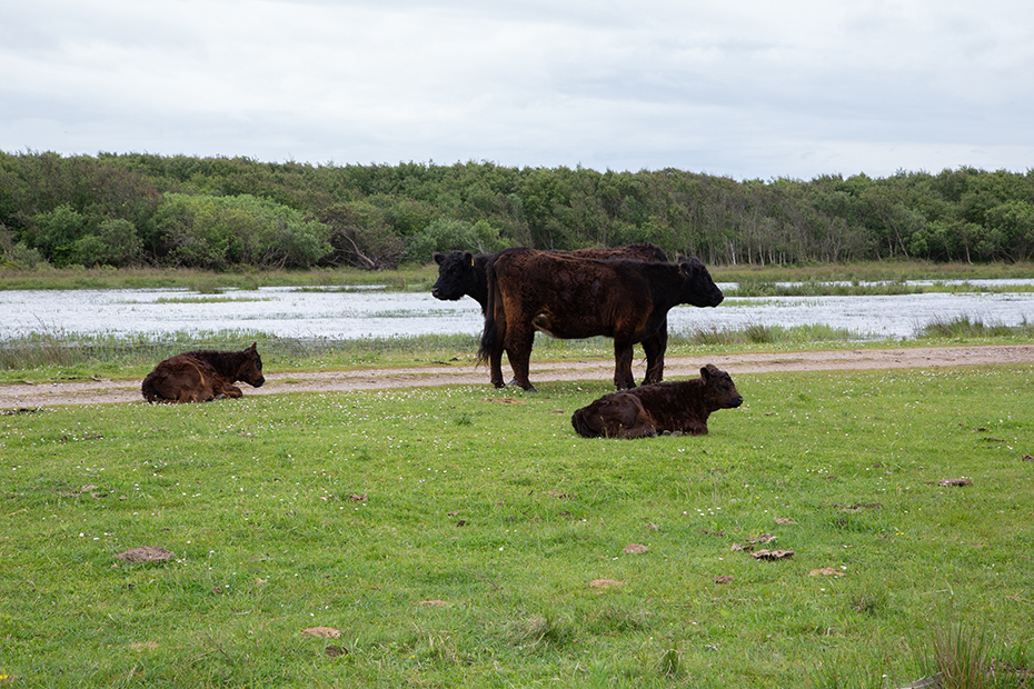 Toen we de hoek om gingen zagen we dat we een probleempje hadden. De kudde Galloway stond in de buurt van het pad. Mijn doel lag aan het einde van dit pad. Daar lag namelijk de poel waar ik vorig jaar de kwakende kikkers heb gefotografeerd. Dan zou ik wel langs de kudde moeten. Mijn man was heel resoluut, hij ging er niet langs. Ik twijfelde.