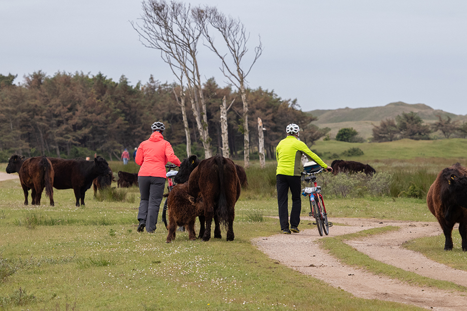 Terwijl ik nog stond te dubben kwam er een echtpaar aanfietsen. Ze stapten af, overlegden samen en wandelden vervolgens tussen de kudde door. Onderwijl maakten ze nog een aantal foto’s. De koeien reageerden niet op hen. Het jong ging rustig door met drinken en de rest ging geen stap aan de kant.