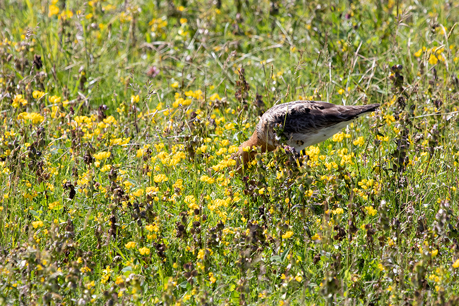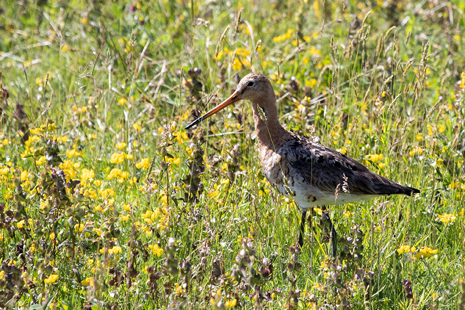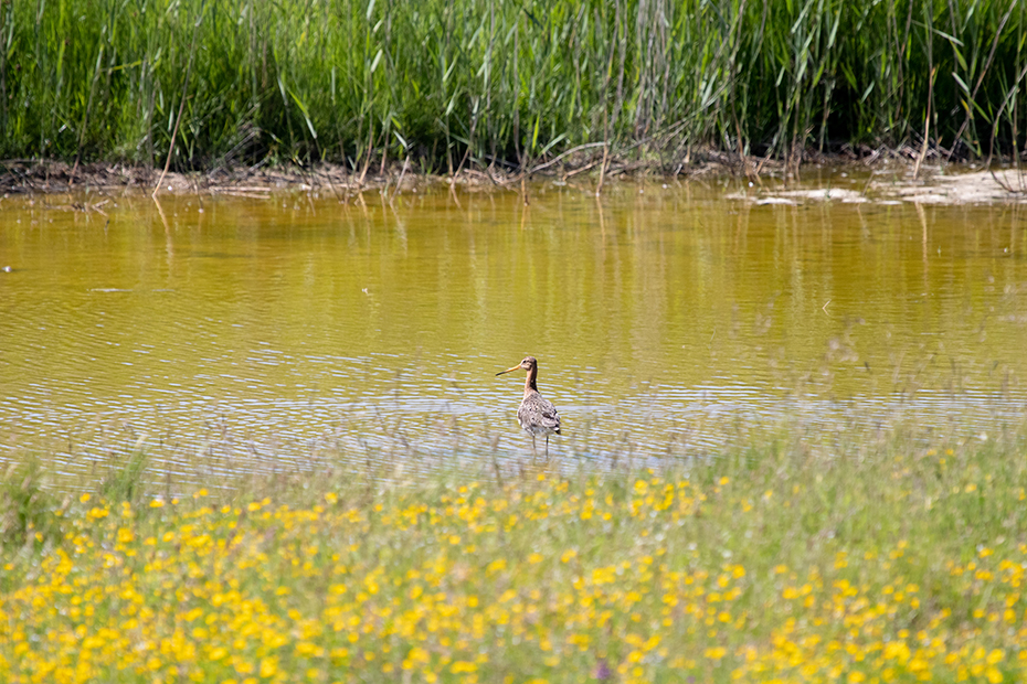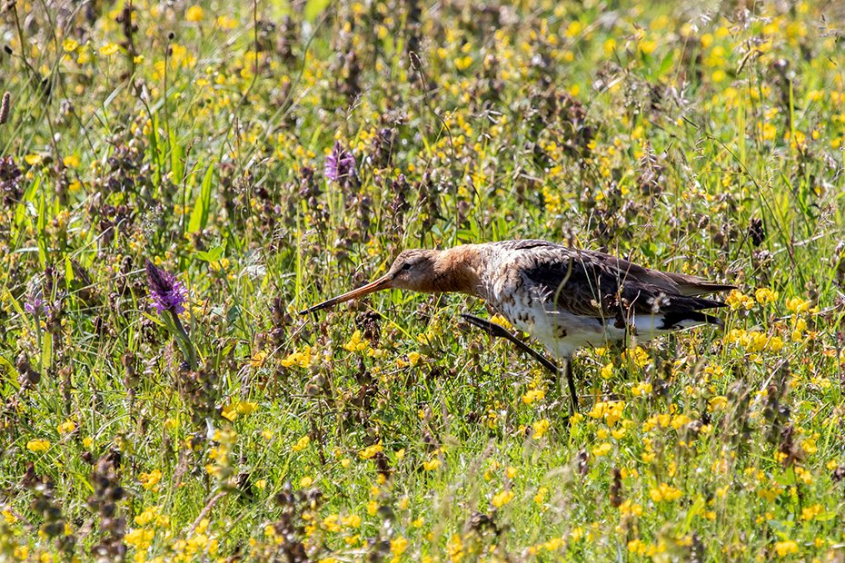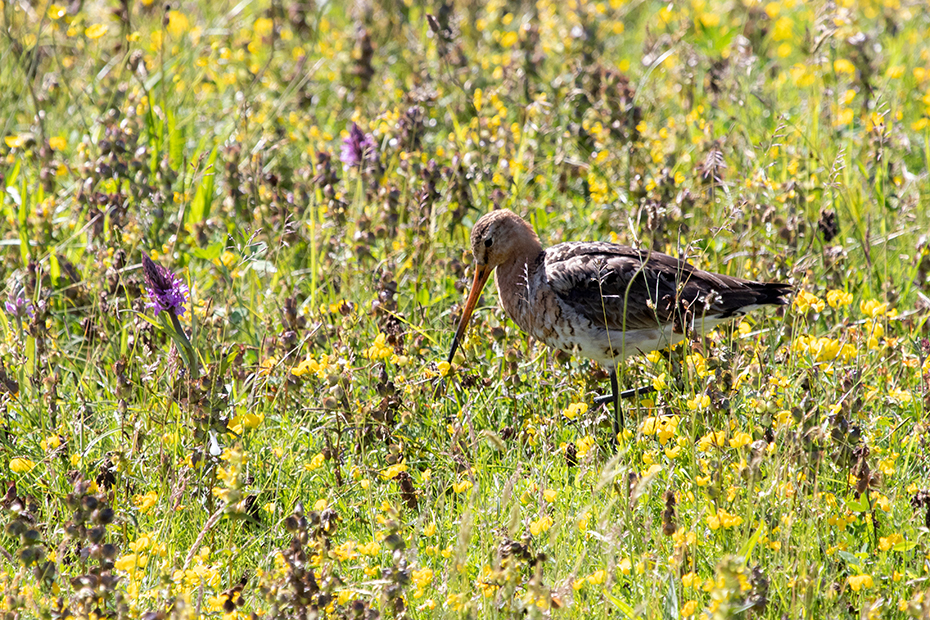 Op het eilandje stonden ook orchissen. De grutto liep voortdurend met de kop naar beneden op zoek naar een lekker hapje. Het was dus wel een kunst om snel een foto te maken als de kop omhoog ging. Ik hoopte dat de grutto richting de orchissen zou lopen zodat ik ze samen op de foto zou krijgen. Mijn wens kwam uit…
