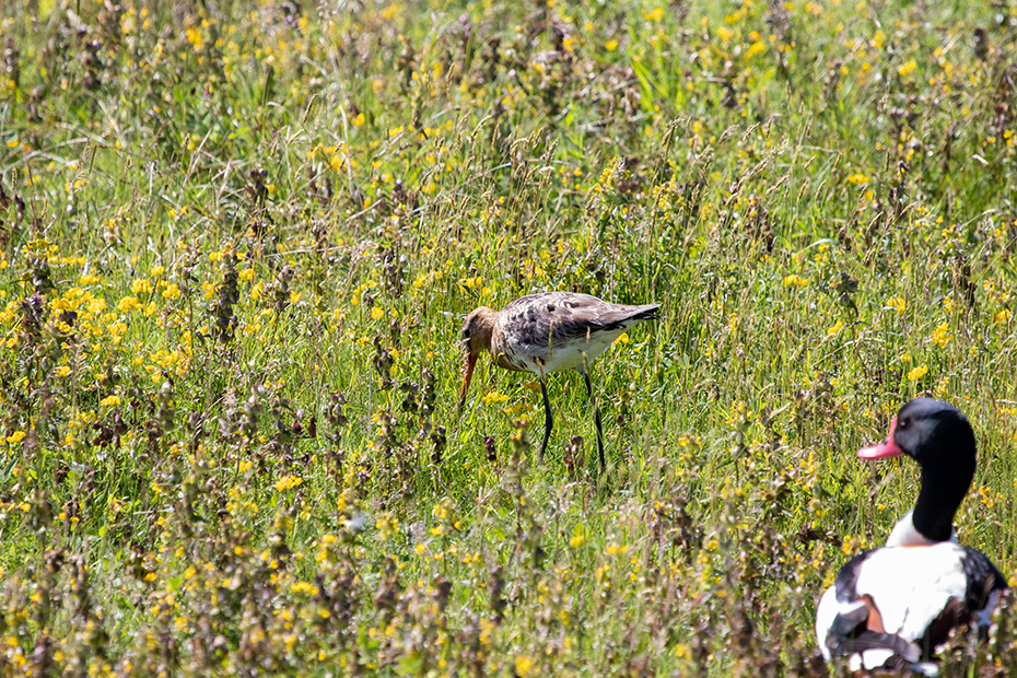 Even later stapte de grutto op een eilandje en ging daar verder met het zoeken naar voedsel. De bergeend keek vanaf een afstandje toe.