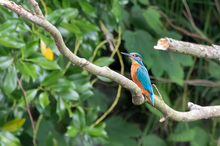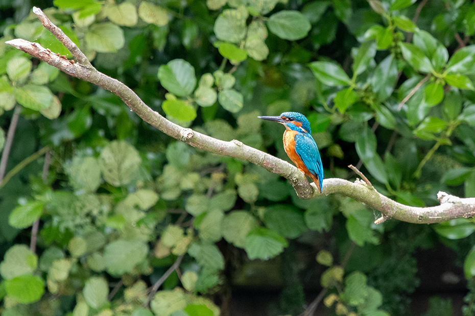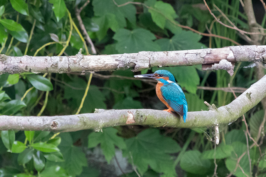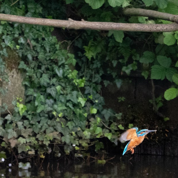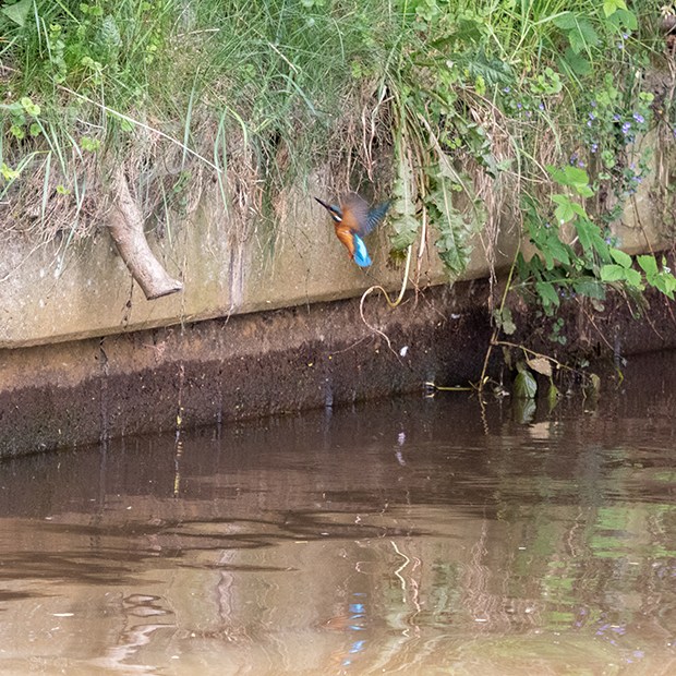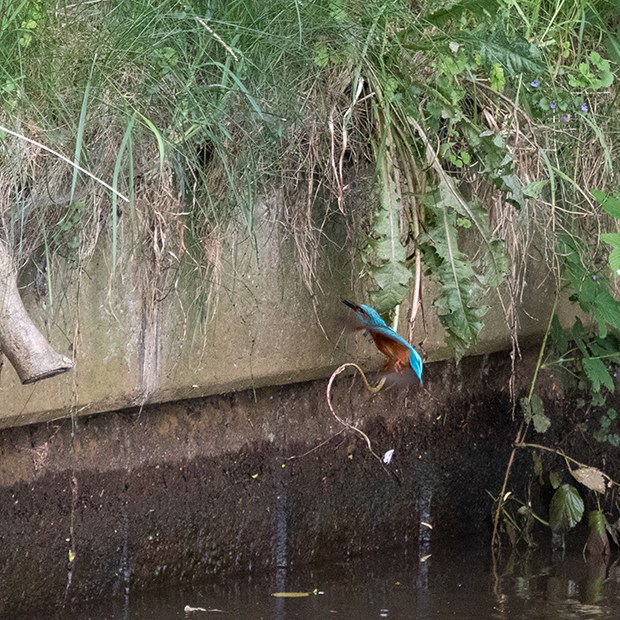 Ik wilde deze keer proberen om de ijsvogel in vlucht te fotograferen. Nadat ik enkele pogingen had gedaan vanuit de auto probeerde ik het vanaf de oever, enigszins verscholen achter het gras.