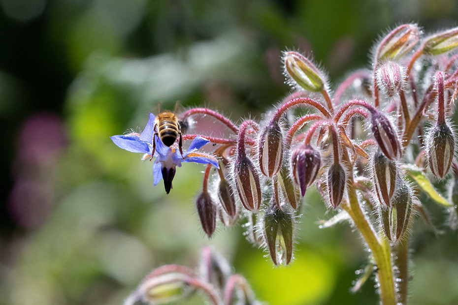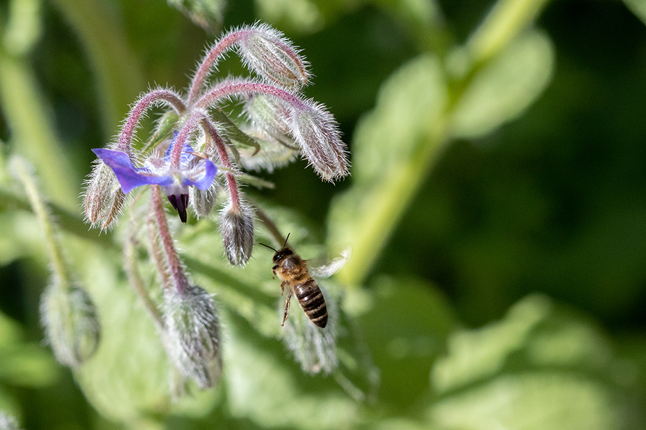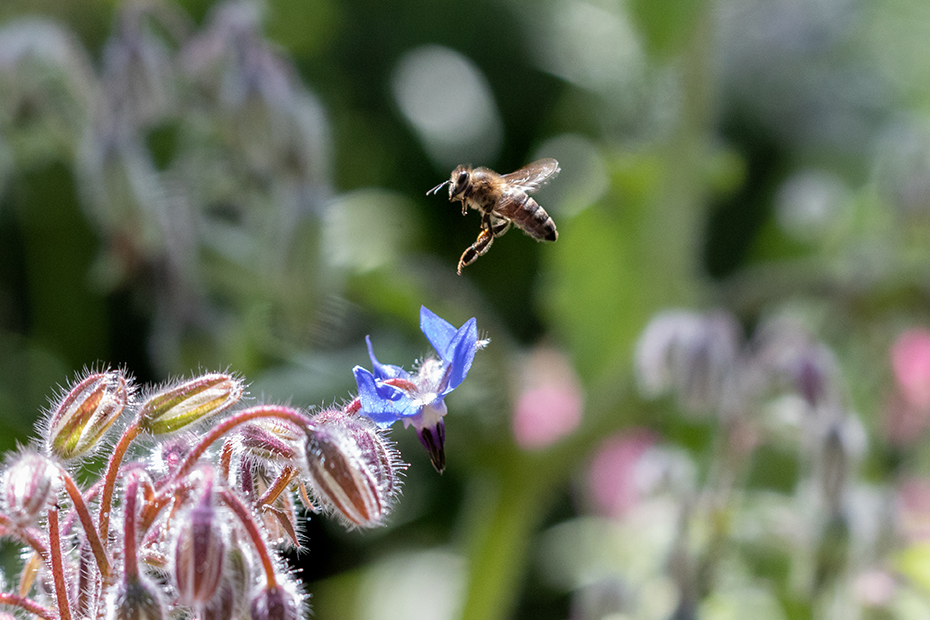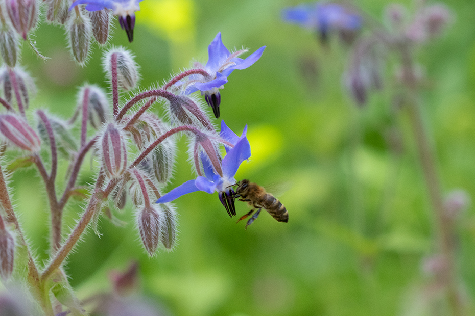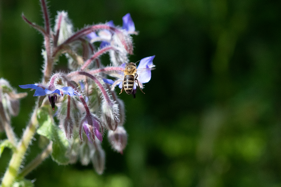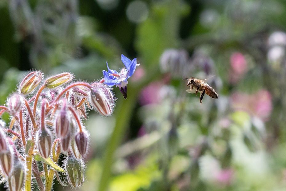 In de border staat Bernagie of ook wel komkommerkruid genoemd. De bloemen zijn enorm geliefd bij de bijen. Ik heb mij daar met de camera een tijdje heerlijk uitgeleefd. De uitdaging zocht ik ook nu weer in het vastleggen van de vliegende bijen.