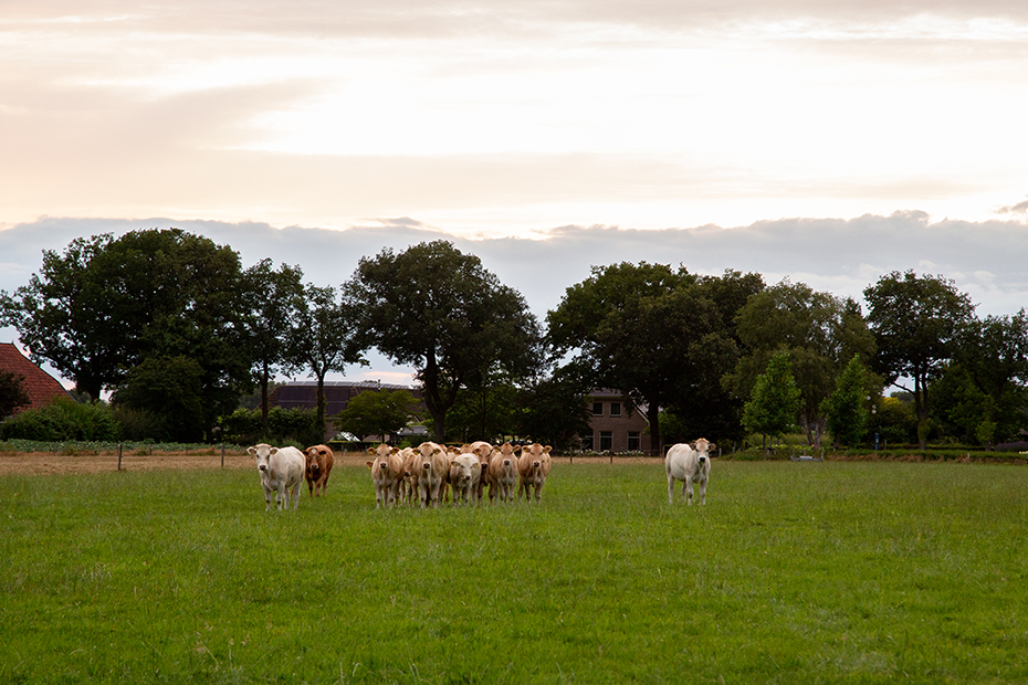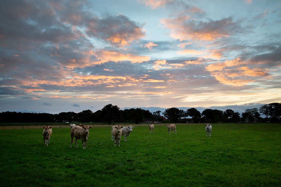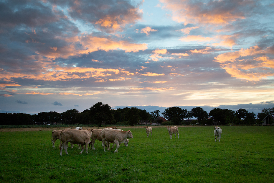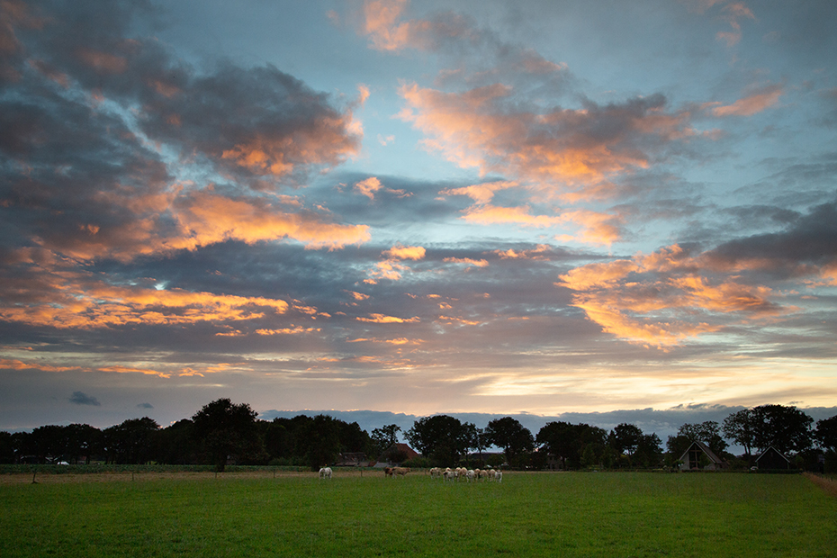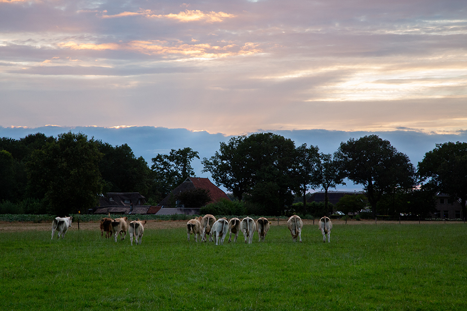 Toen ik na de wandeling bij het witte bruggetje op de Wetering weer arriveerde in ons dorp zag ik dat de lucht mooi kleurde. Ik stopte bij een weiland met koeien. De dames stopten direct met grazen en keken nieuwsgierig wat ik kwam doen.