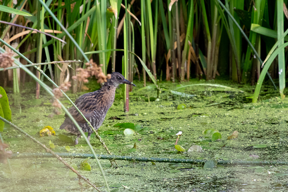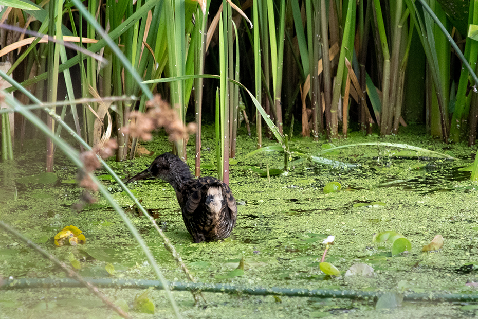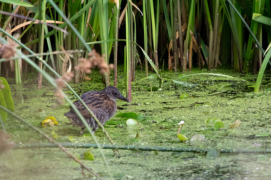 Als de waterral uit de begroeiing tevoorschijn kwam dan was dat altijd maar heel kort. Binnen een minuut verdween de vogel weer uit het zicht. Tel daarbij de begroeiing op de oever erbij op dan begrijpen jullie vast wel dat het niet meeviel om er fatsoenlijke foto’s van te maken.