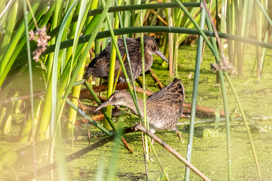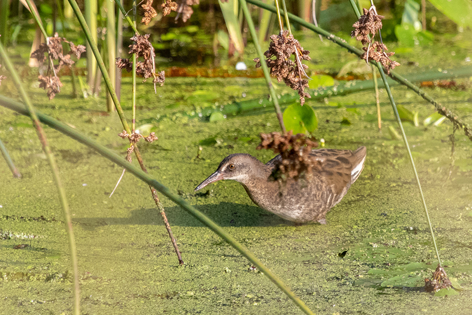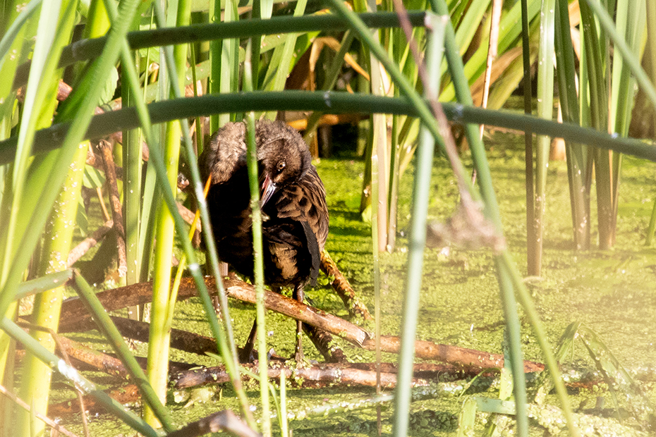 Het volgende moment hoorde ik wat plonzen in de plas. Ik dacht aan een meerkoet of waterhoen. Toen ik door de zoeker keek zag ik dat het een waterral was. Dat was de zoveelste verrassing op die ochtend. Ik heb nog nooit een waterral gezien.