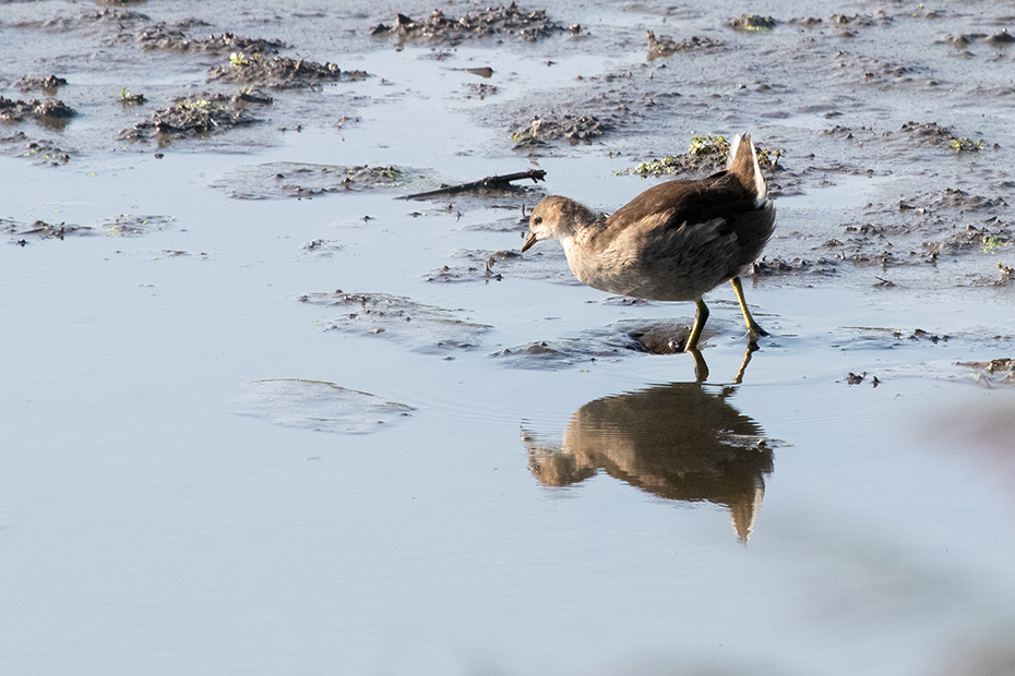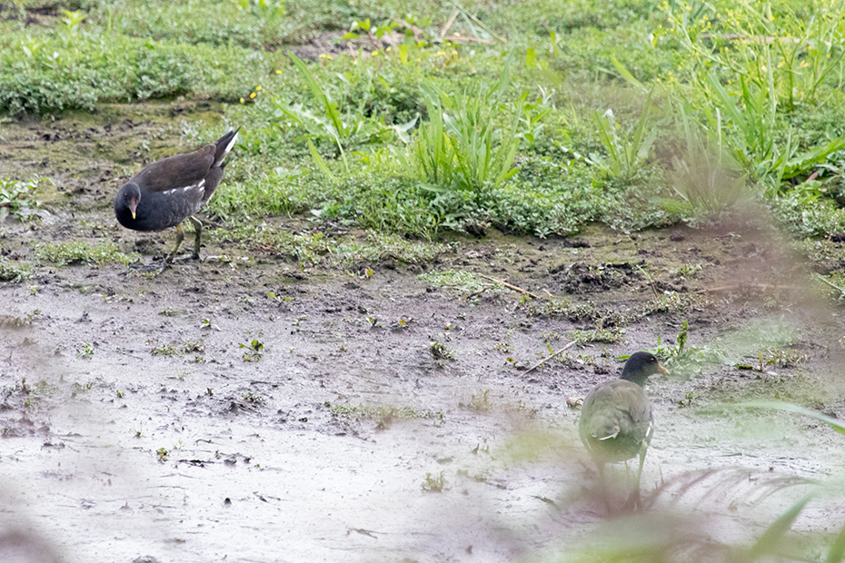 In een kleine ven verscholen achter het riet foerageerden een aantal waterhoentjes. Mijn ervaring is dat ze schuw zijn, bij het minste of geringste verdwenen ze weer in het riet. Ik denk dat het een paartje was met een juveniel.