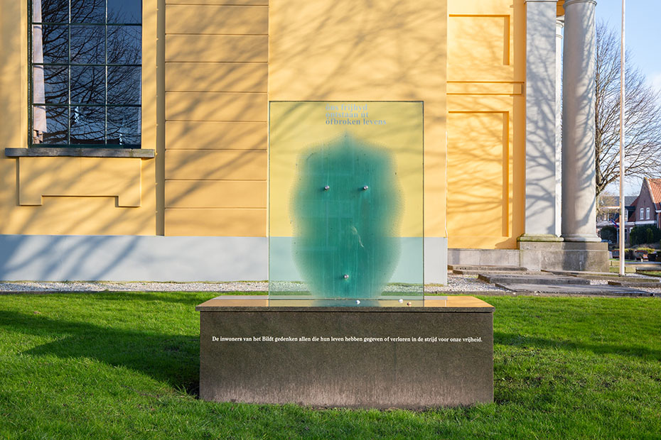 Naast de kerk staat een verzetsmonument. Het kunstwerk is gemaakt door Vreni Wagner, een regionale kunstenares uit Westhoek. Het is een helder transparant object bestaande uit 24 geknibbelde glasplaten. In zowel het glas als de granieten sokkel is de kleur groen verwerkt. Groen is de kleur van de hoop. Op het monument staat de tekst: ‘ôns frijhyd ontstaan út ôfbroken levens’. De inwoners van het Bildt gedenken allen die hun leven hebben gegeven of verloren in de strijd voor onze vrijheid.