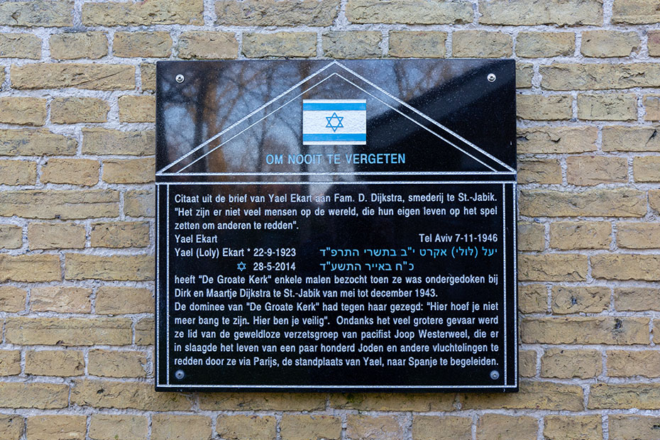 Drie zijden van de kerk zijn gepleisterd en afgewerkt met de kleur Bentheimer geel. Aan de noordzijde (achterkant) van ‘De Groate Kerk’ is de bakstenen muur zichtbaar gebleven. Aan die kant van de kerk hangt een plaquette. Deze plaquette herinnert aan de periode dat de Joodse Yael Ekart in 1943 zat ondergedoken bij de familie Dijkstra. Yael heeft in de periode ‘De Groate Kerk’ enkele malen bezocht.